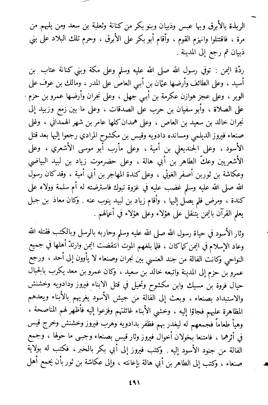 وثار الأسود في حياة رسول الله صلى الله عليه وسلم وحاربه بالرسل وبالكتب فقتله الله وعاد الإسلام في اليمن كما كان، فلما بلغهم الموت انتقضت اليمن وارتدّ أهلها في جميع النواحي وكانت الفالة من جند العنسيّ بين نجران وصنعاء لا يأوون إلى أحد، ورجع عمرو بن حزم إلى المدينة واتبعه خالد بن سعيد، وكان عمرو بن معديكرب بالجبال حيال فروة بن مسيك وابن مكشوح وتحيل في قتل الأبناء فيروز ودادويه وخشنش والاستبداد بصنعاء، وبعث إلى الفالة من جيش الأسود يغريهم بالأبناء ويعدهم المظاهرة عليهم فجاءوا إليه، وخشي الأبناء غائلتهم وفزعوا إليه فأظهر لهم المناصحة، وهيأ طعاما فجمعهم له ليغدر بهم فظفر بدادويه وهرب فيروز وخشنش وخرج قيس في أثرهما، فامتنعا بخولان أخوال فيروز وثار قيس بصنعاء وجبى ما حولها، وجمع الفالة من جنود الأسود إليه. وكتب فيروز إلى أبي بكر بالخبر، فكتب له بولاية صنعاء، وكتب إلى الطاهر بن أبي هالة بإعانته، وإلى عكاشة بن ثور بأن يجمع أهل