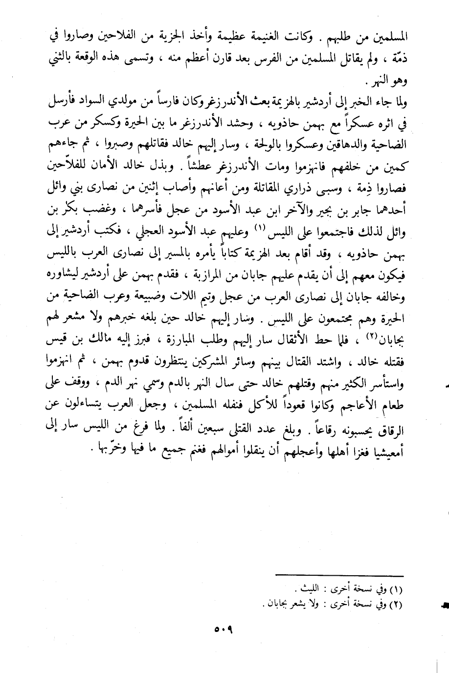 ولما جاء الخبر إلى أردشير بالهزيمة بعث الأندرزغر وكان فارسا من مولدي السواد فأرسل في أثره عسكرا مع بهمن حاذويه، وحشد الأندرزغر ما بين الحيرة وكسكر من عرب الضاحية والدهاقين وعسكروا بالولجة، وسار إليهم خالد فقاتلهم وصبروا، ثم جاءهم كمين من خلفهم فانهزموا ومات الأندرزغر عطشا. وبذل خالد الأمان للفلّاحين فصاروا ذمة، وسبى ذراري المقاتلة ومن أعانهم وأصاب اثنين من نصارى بني وائل أحدهما جابر بن بجير والآخر ابن عبد الأسود من عجل فأسرهما، وغضب بكر بن وائل لذلك فاجتمعوا على الليس [1] وعليهم عبد الأسود العجليّ، فكتب أردشير إلى بهمن حاذويه، وقد أقام بعد الهزيمة كتابا يأمره بالمسير إلى نصارى العرب بالليس فيكون معهم إلى أن يقدم عليهم جابان من المرازبة، فقدم بهم على أردشير ليشاوره وخالفه جابان إلى نصارى العرب من عجل وتيم اللات وضبيعة وعرب الضاحية من الحيرة وهم مجتمعون على الليس. وسار إليهم خالد حين بلغه خبرهم ولا مشعر لهم بجابان [2] ، فلما حط الأثقال سار إليهم وطلب المبارزة، فبرز إليه مالك بن قيس فقتله خالد، واشتد القتال بينهم وسائر المشركين ينتظرون قدوم بهمن، ثم انهزموا واستأسر الكثير منهم وقتلهم خالد حتى سال النهر بالدم وسمي نهر الدم، ووقف على طعام الأعاجم وكانوا قعودا للأكل فنفله المسلمين، وجعل العرب يتساءلون عن الرقاق يحسبونه رقاعا. وبلغ عدد القتلى سبعين ألفا. ولما فرغ من الليس سار إلى أمغيشيا فغزا أهلها وأعجلهم أن ينقلوا أموالهم فغنم جميع ما فيها وخرّبها.