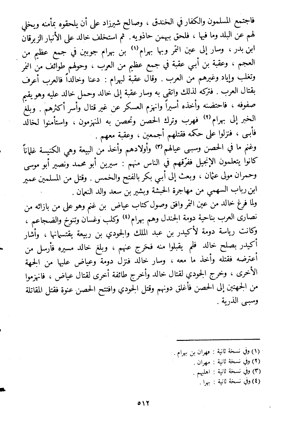 ولما فرغ خالد من عين التمر وافق وصول كتاب عياض بن غنم وهو على من بإزائه من نصارى العرب بناحية دومة الجندل وهم بهرام [4] وكلب وغسان وتنوخ والضجاعم، وكانت رياسة دومة لأكيدر بن عبد الملك والجودي بن ربيعة يقتسمانها، وأشار أكيدر بصلح خالد فلم يقبلوا منه فخرج عنهم، وبلغ خالد مسيره فأرسل من اعترضه فقتله وأخذ ما معه، وسار خالد فنزل دومة وعياض عليها من الجهة الأخرى، وخرج الجودي لقتال خالد وأخرج طائفة أخرى لقتال عياض، فانهزموا من الجهتين إلى الحصن فأغلق دونهم وقتل الجودي وافتتح الحصن عنوة فقتل المقاتلة وسبى الذرية.
