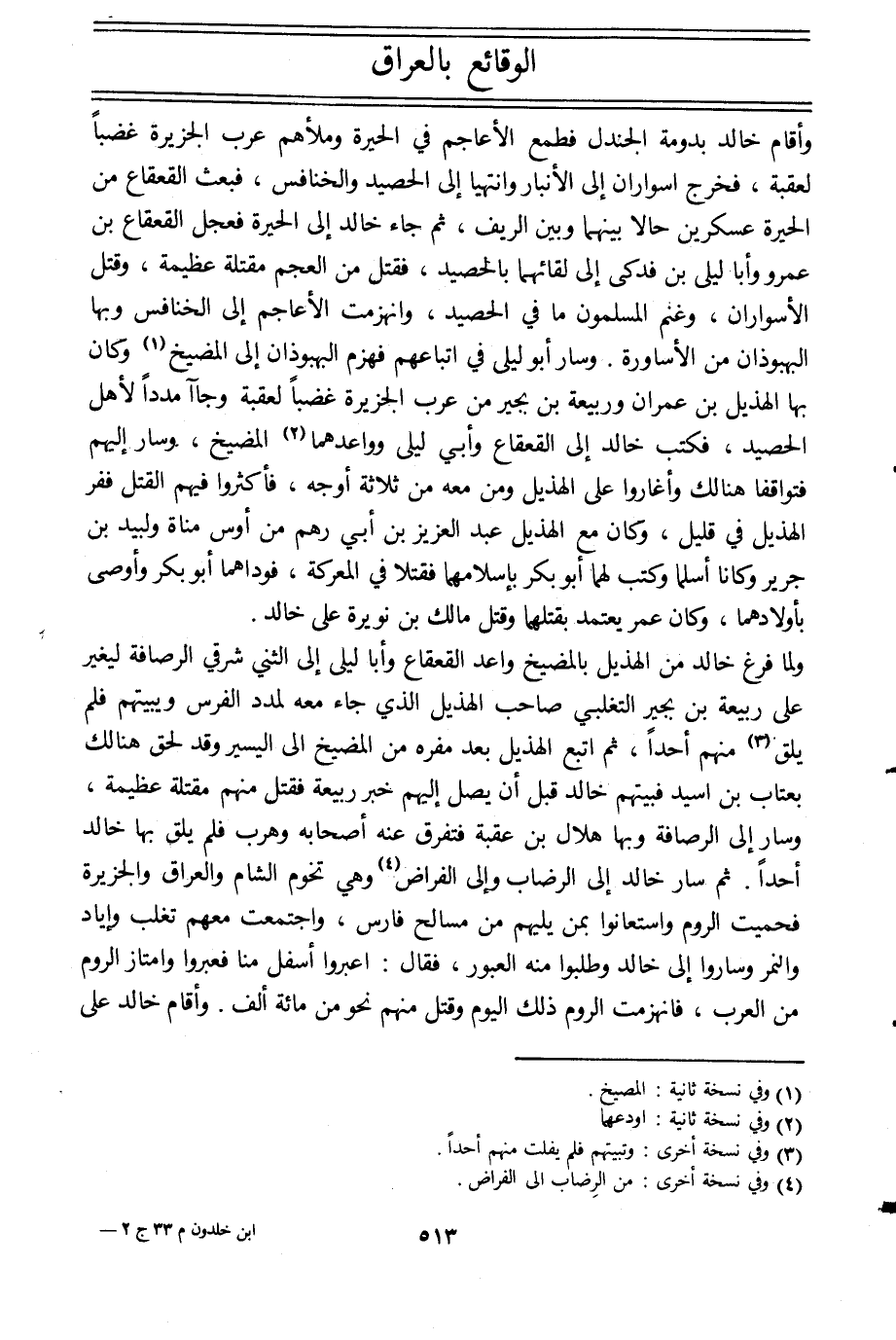 ولما فرغ خالد من الهذيل بالمضيخ واعد القعقاع وأبا ليلى إلي الثني شرقي الرصافة ليغير على ربيعة بن بحير التغلبي صاحب الهذيل الّذي جاء معه لمدد الفرس ويبيتهم فلم يلق [3] منهم أحدا، ثم اتبع الهذيل بعد مفره من المضيخ الى اليسير وقد لحق هنالك بعتاب بن السيد فبيتهم خالد قبل أن يصل إليهم خبر ربيعة فقتل منهم مقتلة عظيمة، وسار إلى الرصافة وبها هلال بن عقبة فتفرق عنه أصحابه وهرب فلم يلق بها خالد أحدا. ثم سار خالد إلى الرضاب وإلى الفراض [4] وهي تخوم الشام والعراق والجزيرة فحميت الروم واستعانوا بمن يليهم من مسالح فارس، واجتمعت معهم تغلب وإياد والنمر وساروا إلى خالد وطلبوا منه العبور، فقال: اعبروا أسفل منا فعبروا وامتاز الروم من العرب، فانهزمت الروم ذلك اليوم وقتل منهم نحو من مائة ألف. وأقام خالد على