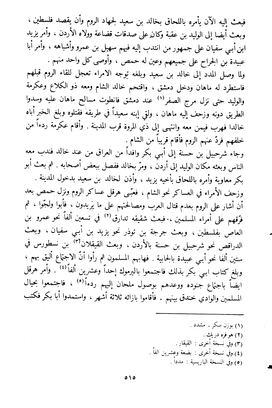 وزحف الأمراء في العساكر نحو الشام، فعبّى هرقل عساكر الروم ونزل حمص بعد أن أشار على الروم بعدم قتال العرب ومصالحتهم على ما يريدون، فأبوا ولجّوا، ثم فرّقهم على أمراء المسلمين، فبعث شقيقه تدارق [2] في تسعين ألفا نحو عمرو بن العاص بفلسطين، وبعث جرجة بن توذر نحو يزيد بن أبي سفيان، وبعث الدراقص نحو شرحبيل بن حسنة بالأردن، وبعث القيقلان [3] بن نسطورس في ستين ألفا نحو أبي عبيدة بالجابية. فهابهم المسلمون ثم رأوا أنّ الاجتماع أليق بهم، وبلغ كتاب أبي بكر بذلك فاجتمعوا باليرموك أحدا وعشرين ألفا [4] . وأمر هرقل أيضا باجتماع جنوده ووعدهم بوصول ملحان إليهم ردءا [5] ، فاجتمعوا بحيال المسلمين والوادي خندق بينهم، فأقاموا بإزائه ثلاثة أشهر، واستمدوا أبا بكر فكتب