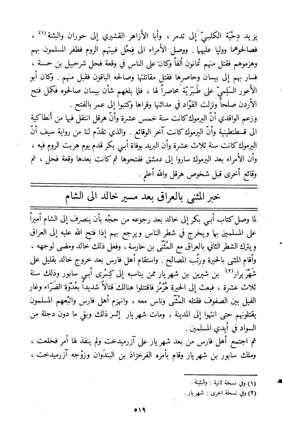 لما وصل كتاب أبي بكر إلى خالد بعد رجوعه من حجّة بأن ينصرف إلى الشام أميرا على المسلمين بها ويخرج في شطر الناس ويرجع بهم إذا فتح الله عليه وإلى العراق ويترك الشطر الثاني بالعراق مع المثنّى بن حارسة، وفعل ذلك خالد ومضى لوجهه، وأقام المثنى بالحيرة ورتّب المصالح. واستقام أهل فارس بعد خروج خالد بقليل على شهريرار [2] بن شيرين بن شهريار ممن يناسبه إلى كسرى أبي سابور وذلك سنة ثلاث عشرة، فبعث إلى الحيرة هرمز فاقتتلوا هنالك قتالا شديدا بعدوة الضرّاء وغار الفيل بين الصفوف فقتله المثنّى وناس معه، وانهزم أهل فارس واتّبعهم المسلمون يقتلونهم حتى انتهوا إلى المدينة، ومات شهريار إثر ذلك وبقي ما دون دجلة من السواد في أيدي المسلمين.