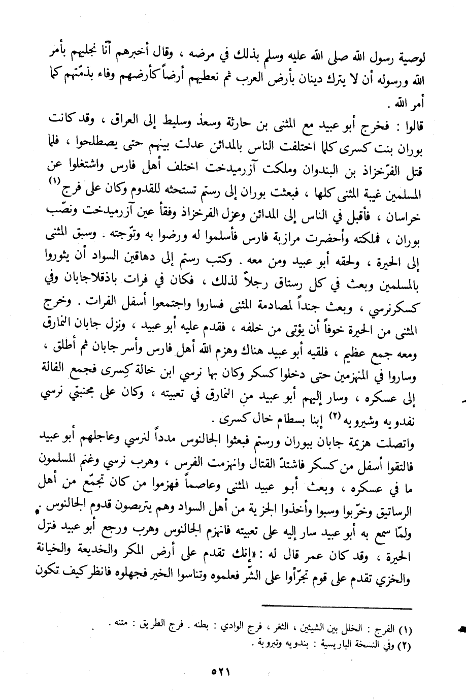قالوا: فخرج أبو عبيد مع المثنى بن حارثة وسعد وسليط إلى العراق، وقد كانت بوران بنت كسرى كلما اختلفت الناس بالمدائن عدلت بينهم حتى يصلحوا، فلما قتل الفرّخزاد بن البندوان وملكت آزرميدخت اختلف أهل فارس واشتغلوا عن المسلمين غيبة المثنى كلها، فبعثت بوران إلى رستم تستحثه للقدوم وكان على فرج [1] خراسان، فأقبل في الناس إلى المدائن وعزل الفرخزاد وفقأ عين آزرميدخت ونصبّ بوران، فملكته وأحضرت مرازبة فارس فأسلموا له ورضوا به وتوّجته. وسبق المثنى إلى الحيرة، ولحقه أبو عبيد ومن معه. وكتب رستم إلى دهاقين السواد أن يثوروا بالمسلمين وبعث في كل رستاق رجلا لذلك، فكان في فرات باذقلا جابان وفي كسكرنرسي، وبعث جندا لمصادمة المثنى فساروا واجتمعوا أسفل الفرات. وخرج المثنى من الحيرة خوفا أن يؤتى من خلفه، فقدم عليه أبو عبيد، ونزل جابان النمارق ومعه جمع عظيم، فلقيه أبو عبيد هناك وهزم الله أهل فارس وأسر جابان ثم أطلق، وساروا في المنهزمين حتى دخلوا كسكر وكان بها نرسي ابن خالة كسرى فجمع الفالة إلى عسكره، وسار إليهم أبو عبيد من النمارق في تعبيته، وكان على مجنبتي نرسي نفدويه وشيرويه [2] ابنا بسطام خال كسرى.