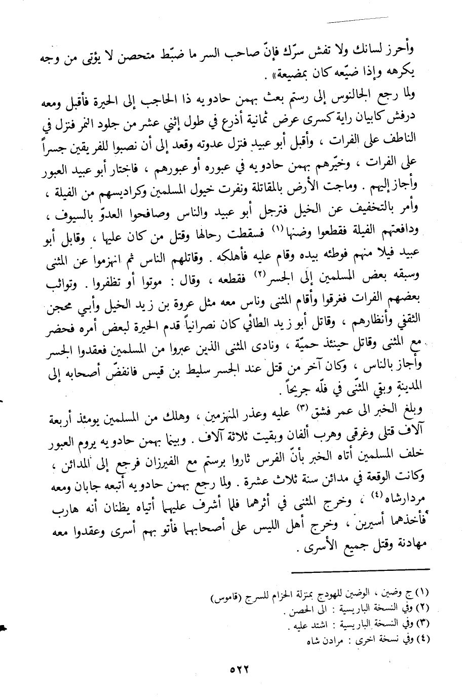 وبلغ الخبر إلى عمر فشق [3] عليه وعذر المنهزمين، وهلك من المسلمين يومئذ أربعة آلاف قتلى وغرقى وهرب ألفان وبقين ثلاثة آلاف. وبينما بهمن حادويه يروم العبور خلف المسلمين أتاه الخبر بأنّ الفرس ثاروا برستم مع الفيرزان فرجع إلى المدائن، وكانت الوقعة في مدائن سنة ثلاث عشرة. ولما رجع بهمن حادويه أتبعه جابان ومعه مردان شاه [4] ، وخرج المثنى في أثرهما فلما أشرف عليهما أتياه يظنان أنه هارب فأخذهما أسيرين، وخرج أهل الليس على أصحابهما فأتوا بهم أسرى وعقدوا معه مهادنة وقتل جميع الأسرى.