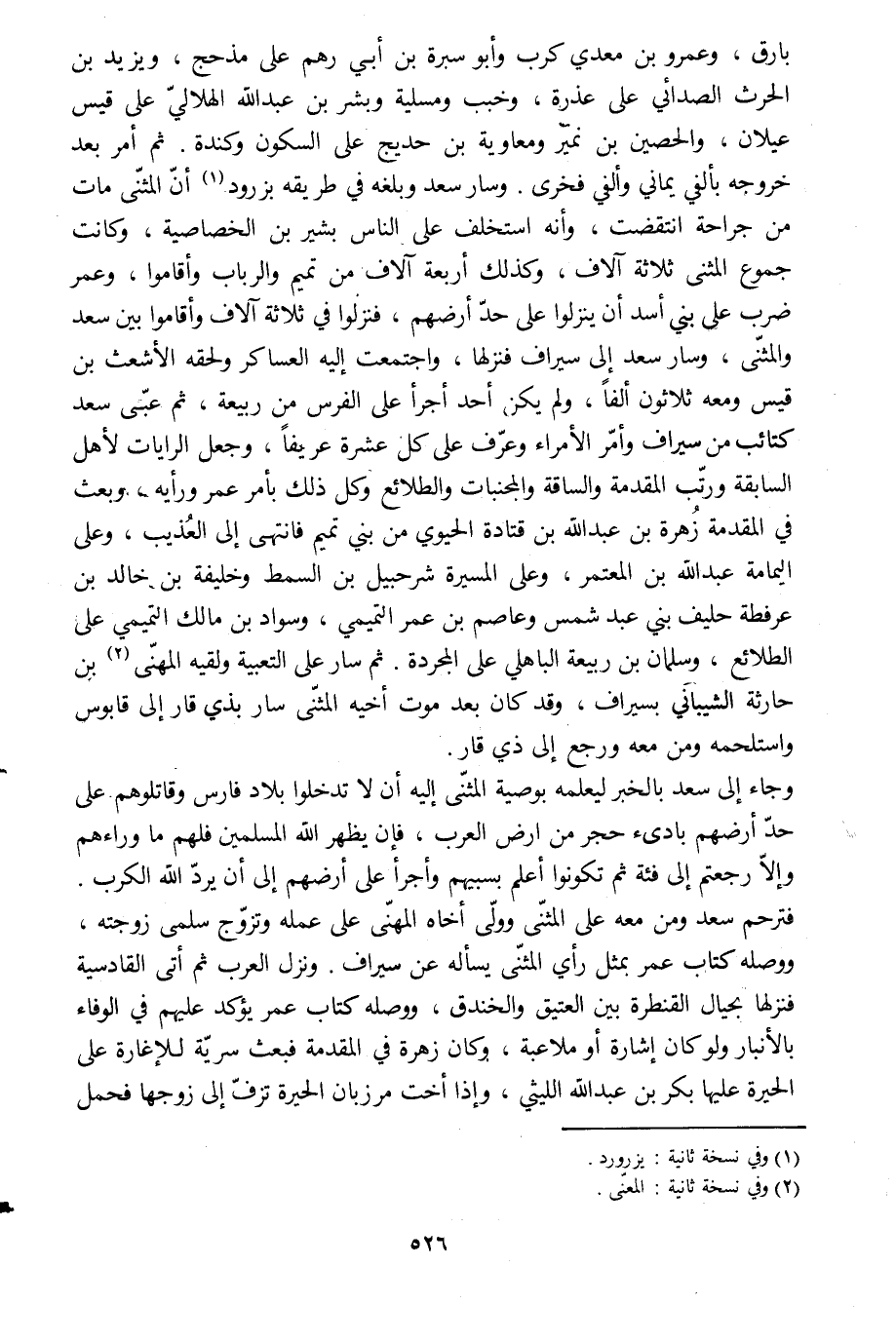 بارق، وعمرو بن معديكرب وأبو سبرة بن أبي رهم على مذحج، ويزيد بن الحرث الصدائي على عذرة، وخبب ومسلية وبشر بن عبد الله الهلاليّ على قيس عيلان، والحصين بن نمير ومعاوية بن حديج على السكون وكندة. ثم أمر بعد خروجه بألفي يماني وألفي فخرى. وسار سعد وبلغه في طريقه بزرود [1] أنّ المثنّى مات من جراحة انتقضت، وأنه استخلف على الناس بشير بن الخصاصية، وكانت جموع المثنى ثلاثة آلاف، وكذلك أربعة آلاف من تميم والرباب وأقاموا، وعمر ضرب على بني أسد أن ينزلوا على حدّ أرضهم، فنزلوا في ثلاثة آلاف وأقاموا بين سعد والمثنّى، وسار سعد إلى سيراف فنزلها، واجتمعت إليه العساكر ولحقه الأشعث بن قيس ومعه ثلاثون ألفا، ولم يكن أحد أجرأ على الفرس من ربيعة، ثم عبّى سعد كتائب من سيراف وأمّر الأمراء وعرّف على كل عشرة عريفا، وجعل الرايات لأهل السابقة ورتّب المقدمة والساقة والمجنبات والطلائع وكل ذلك بأمر عمر ورأيه، وبعث في المقدمة زهرة بن عبد الله بن قتادة الحيوي من بني تميم فانتهى إلى العذيب، وعلى اليمامة عبد الله بن المعتمر، وعلى المسيرة شرحبيل بن السمط وخليفة بن خالد بن عرفطة حليف بني عبد شمس وعاصم بن عمر التميمي، وسواد بن مالك التميمي على الطلائع، وسلمان بن ربيعة الباهلي على المجردة. ثم سار على التعبية ولقيه المهنّي [2] بن حارثة الشيبانيّ بسيراف، وقد كان بعد موت أخيه المثنّى سار بذي قار إلى قابوس واستلحمه ومن معه ورجع إلى ذي قار.