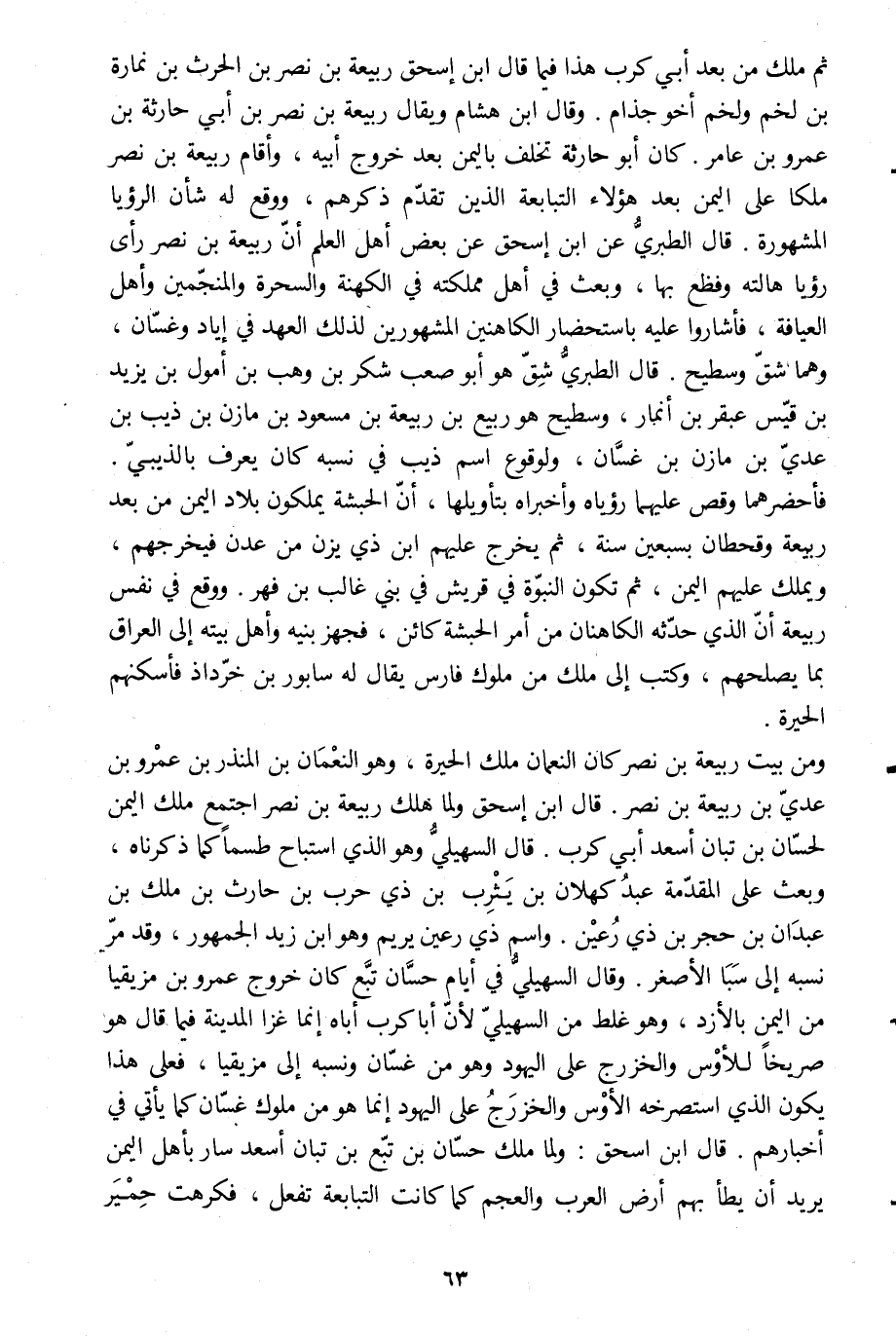 ومن بيت ربيعة بن نصر كان النعمان ملك الحيرة، وهو النعمان بن المنذر بن عمرو بن عديّ بن ربيعة بن نصر. قال ابن إسحاق ولما هلك ربيعة بن نصر اجتمع ملك اليمن لحسّان بن تبان أسعد أبي كرب. قال السهيليّ وهو الّذي استباح طسما كما ذكرناه، وبعث على المقدّمة عبد كهلان بن يثرب بن ذي حرب بن حارث بن ملك بن عبدان بن حجر بن ذي رعين. واسم ذي رعين يريم وهو ابن زيد الجمهور، وقد مرّ نسبه إلى سبا الأصغر. وقال السهيليّ في أيام حسّان تبّع كان خروج عمرو بن مزيقياء من اليمن بالأزد، وهو غلط من السهيليّ لأنّ أبا كرب أباه إنما غزا المدينة فيما قال هو صريخا للأوس والخزرج على اليهود وهو من غسّان ونسبه إلى مزيقياء، فعلى هذا يكون الّذي استصرخه الأوس والخزرج على اليهود إنما هو من ملوك غسّان كما يأتي في أخبارهم. قال ابن إسحاق: ولما ملك حسّان بن تبّع بن تبان أسعد سار بأهل اليمن يريد أن يطأ بهم أرض العرب والعجم كما كانت التبابعة تفعل، فكرهت حمير