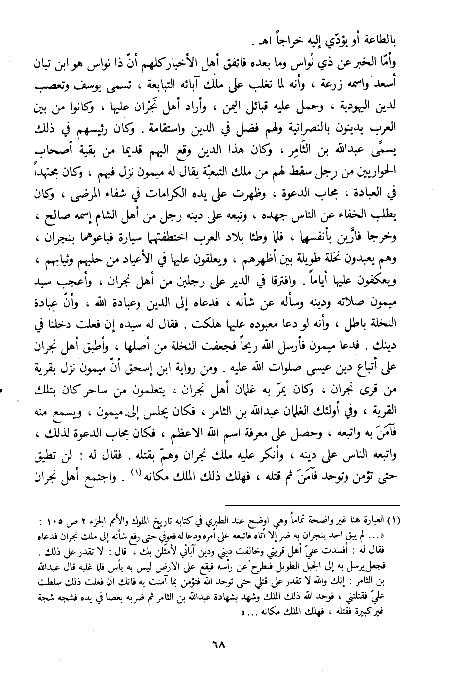 وأمّا الخبر عن ذي نواس وما بعده فاتفق أهل الأخبار كلهم أنّ ذا نواس هو ابن تبان أسعد واسمه زرعة، وأنه لما تغلب على ملك آبائه التبابعة، تسمى يوسف وتعصب لدين اليهودية، وحمل عليه قبائل اليمن، وأراد أهل نجران عليها، وكانوا من بين العرب يدينون بالنصرانية ولهم فضل في الدين واستقامة. وكان رئيسهم في ذلك يسمّى عبد الله بن الثامر، وكان هذا الدين وقع اليهم قديما من بقية أصحاب الحواريين من رجل سقط لهم من ملك التبعيّة يقال له ميمون نزل فيهم، وكان مجتهدا في العبادة، مجاب الدعوة، وظهرت على يده الكرامات في شفاء المرضى، وكان يطلب الخفاء عن الناس جهده، وتبعه على دينه رجل من أهل الشام اسمه صالح، وخرجا فارّين بأنفسهما، فلما وطئا بلاد العرب اختطفتهما سيارة فباعوهما بنجران، وهم يعبدون نخلة طويلة بين أظهرهم، ويعلقون عليها في الأعياد من حليهم وثيابهم، ويعكفون عليها أياما. وافترقا في الدير على رجلين من أهل نجران، وأعجب سيد ميمون صلاته ودينه وسأله عن شأنه، فدعاه إلى الدين وعبادة الله، وأنّ عبادة النخلة باطل، وأنه لو دعا معبوده عليها هلكت. فقال له سيده إن فعلت دخلنا في دينك. فدعا ميمون فأرسل الله ريحا فجعفت النخلة من أصلها، وأطبق أهل نجران على أتباع دين عيسى صلوات الله عليه. ومن رواية ابن إسحاق أنّ ميمون نزل بقرية من قرى نجران، وكان يمرّ به غلمان أهل نجران، يتعلمون من ساحر كان بتلك القرية، وفي أولئك الغلمان عبد الله بن الثامر، فكان يجلس إلى ميمون، ويسمع منه فآمن به واتبعه، وحصل على معرفة اسم الله الأعظم، فكان مجاب الدعوة لذلك، واتبعه الناس على دينه، وأنكر عليه ملك نجران وهمّ بقتله. فقال له: لن تطيق حتى تؤمن وتوحد فآمن ثم قتله، فهلك ذلك الملك مكانه [1] . واجتمع أهل نجران