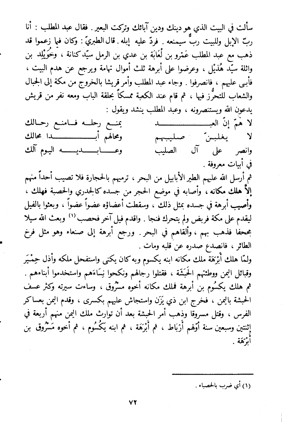 سألت في البيت الّذي هو دينك ودين آبائك وتركت البعير. فقال عبد المطلب: أنا ربّ الإبل وللبيت ربّ سيمنعه. فردّ عليه إبله. قال الطبريّ: وكان فيما زعموا قد ذهب مع عبد المطلب عمرو بن لعابة بن عدي بن الرمل سيّد كنانة، وخويلد بن واثلة سيّد هذيل، وعرضوا على أبرهة ثلث أموال تهامة ويرجع عن هدم البيت، فأبى عليهم، فانصرفوا. وجاء عبد المطلب وأمر قريشا بالخروج من مكة إلى الجبال والشعاب للتحرّز فيها، ثم قام عند الكعبة ممسكا بحلقة الباب ومعه نفر من قريش يدعون الله ويستنصرونه، وعبد المطلب ينشد ويقول: