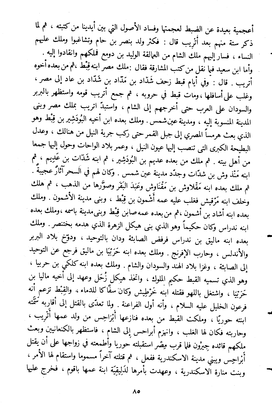 أعجمية بعيدة عن الضبط لعجمتها وفساد الأصول التي بين أيدينا من كتبته، ثم لما ذكر ستة منهم بعد أتريب قال: فكثر ولد بنصر بن حام وتشاغبوا وملك عليهم النساء، فسار إليهم ملك الشام من العمالقة الوليد بن دومع فملكهم وانقادوا إليه.