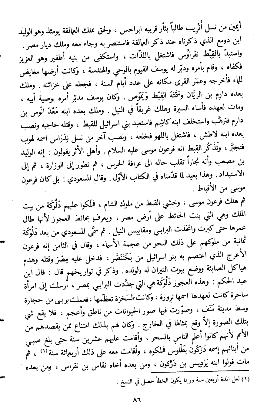 ثم هلك فرعون موسى، وخشي القبط من ملوك الشام، فملّكوا عليهم دلوكة من بيت الملك وهي التي بنت الحائط على أرض مصر، ويعرف بحائط العجوز لأنها طال عمرها حتى كبرت واتخذت البرابي ومقاييس النيل. ثم سمّى المسعودي من بعد دلوكة ثمانية من ملوكهم على ذلك النحو من عجمة الأسماء، وقال في الثامن إنه فرعون الأعرج الّذي اعتصم به بنو إسرائيل من بخت نصّر، فدخل عليه مصر وقتله وهدم هياكل الصابئة ووضع بيوت النيران له ولولده. وذكر في تواريخهم قال: قال ابن عبد الحكم: وهذه العجوز دلوكة هي التي جدّدت البرابي بمصر، أرسلت إلى امرأة ساحرة كانت لعهدها اسمها ترورة، وكانت السحرة تعظّمها، فعملت بربي من حجارة وسط مدينة منف، وصوّرت فيها صور الحيوانات من ناطق وأعجم، فلا يقع شيء بتلك الصورة إلّا وقع بمثالها في الخارج. وكان لهم بذلك امتناع ممن يقصدهم من الأمم لأنهم كانوا أعلم الناس بالسحر، وأقامت عليهم عشرين سنة حتى بلغ صبي من أبنائهم اسمه دركون بطلوس فملكوه، وأقامت معه على ذلك أربعمائة سنة [1] ، ثم مات فولوا ابنه يرديس بن دركون، ومن بعده أخاه نقاس بن نقراس، ومن بعده