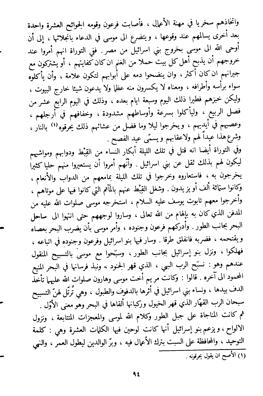 واتخاذهم سخريا في مهنة الأعمال، فأصابت فرعون وقومه الجوائح العشرة واحدة بعد أخرى يسالمهم عند وقوعها، ويتضرع الى موسى في الدعاء بانجلائها، إلى أن أوحى الله الى موسى بخروج بني إسرائيل من مصر. ففي التوراة انهم أمروا عند خروجهم أن يذبح أهل كل بيت حملا من الغنم ان كان كفايتهم، أو يشتركون مع جيرانهم ان كان أكثر، وان ينضحوا دمه على أبوابهم لتكون علامة، وأن يأكلوه سواء برأسه وأطرافه، ومعناه لا يكسرون منه عظما ولا يدعون شيئا خارج البيوت، وليكن خبزهم فطيرا ذلك اليوم وسبعة أيام بعده، وذلك في اليوم الرابع عشر من فصل الربيع، وليأكلوا بسرعة وأوساطهم مشدودة، وخفافهم في أرجلهم، وعصيهم في أيديهم، ويخرجوا ليلا وما فضل من عشائهم ذلك يحرقوه [1] بالنار، وشرع هذا عيدا لهم ولا عقابهم ويسمّى عيد الفصح.