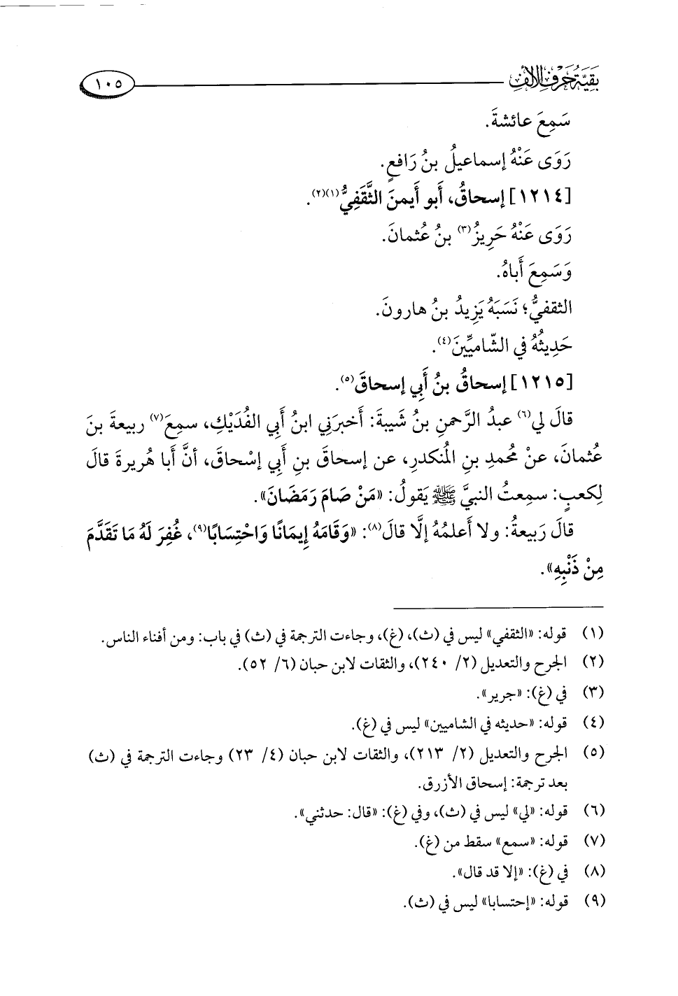 (¬٥) الجرح والتعديل (٢/ ٢١٣)، والثقات لابن حبان (٤/ ٢٣) وجاءت الترجمة في (ث) بعد ترجمة: إسحاق الأزرق.