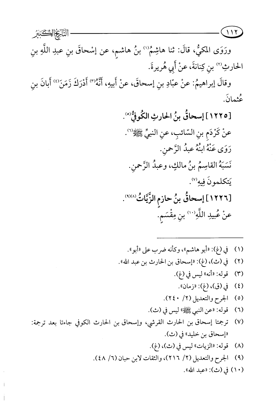 (¬٧) ترجمتا إسحاق بن الحارث القرشي، وإسحاق بن الحارث الكوفي جاءتا بعد ترجمة: "إسحاق بن خليد" في (ث).
