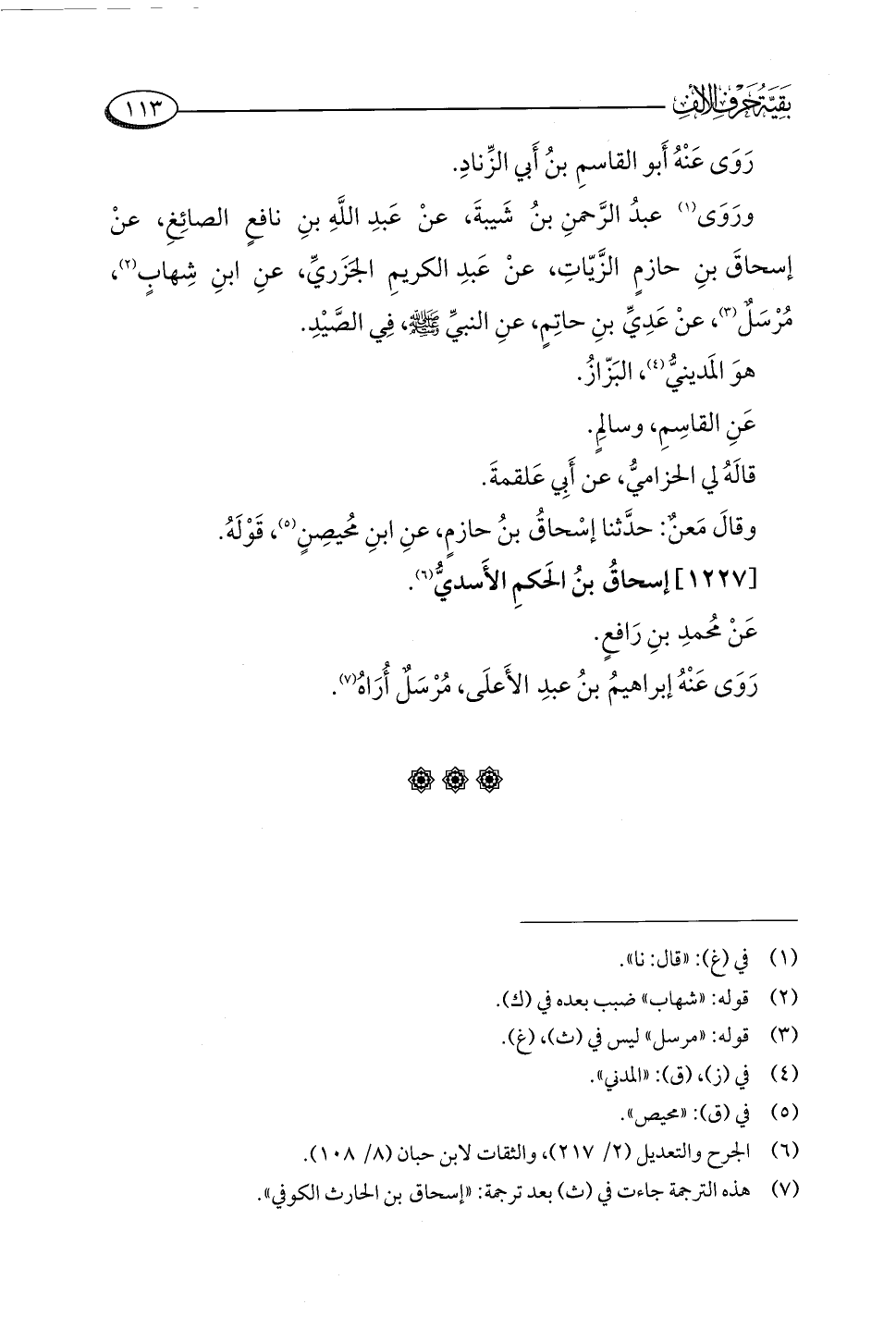 (¬٧) هذه الترجمة جاءت في (ث) بعد ترجمة: "إسحاق بن الحارث الكوفي".