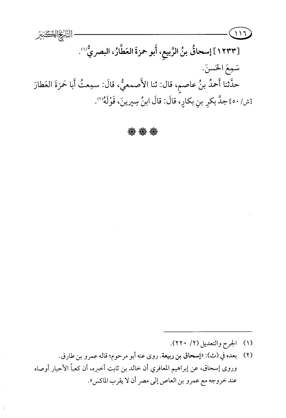حدَّثنا أَحمدُ بنُ عاصمٍ، قَالَ: ثنا الأَصمعيُّ، قالَ: سمِعتُ أَبا حَمزةَ العَطارَ جدَّ بكرِ بنِ بكارٍ، قالَ: قالَ ابنُ سِيرينَ، قَوْلَهُ (¬٢).