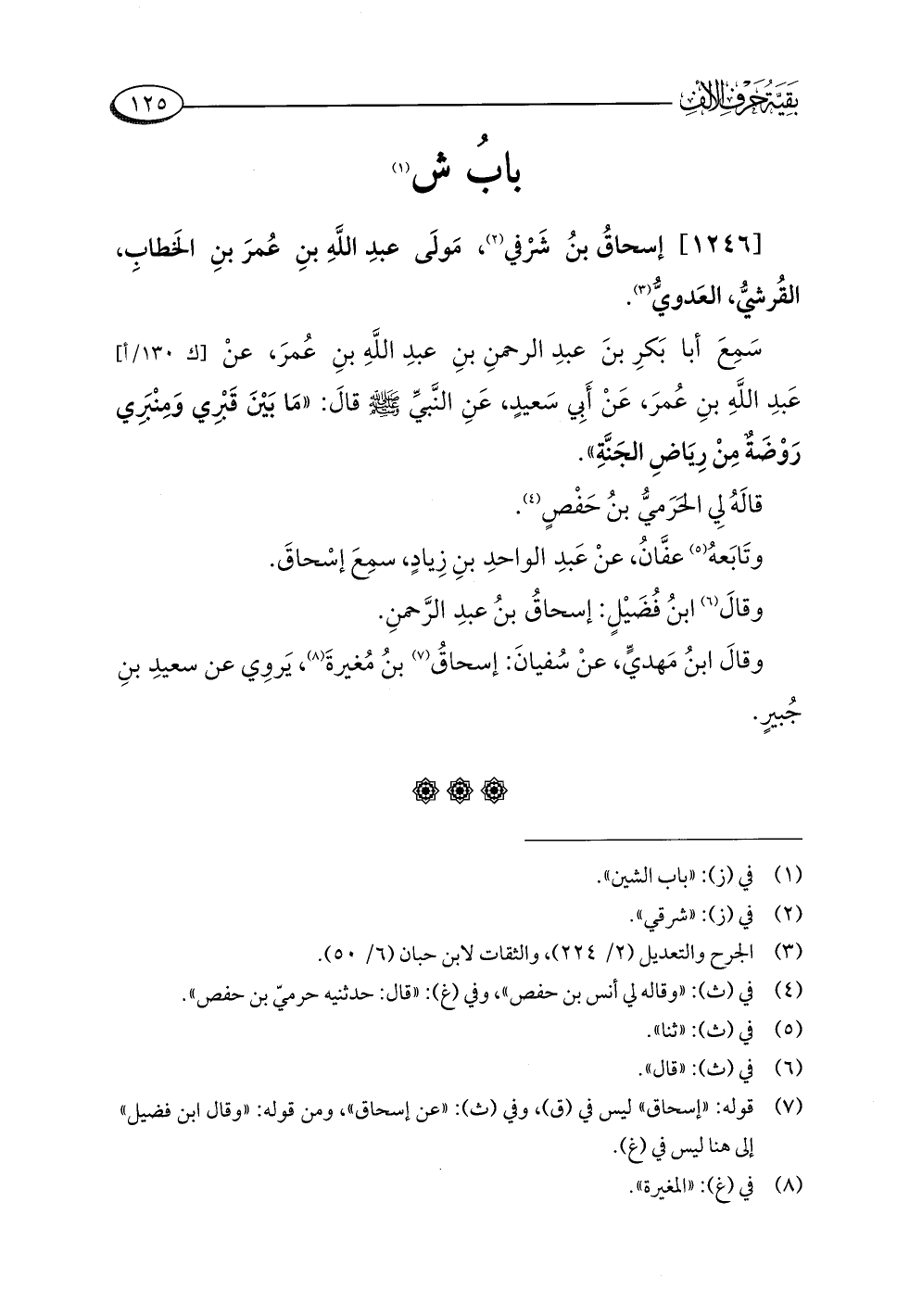 [١٢٤٦] إسحاقُ بنُ شَرْفِى (¬٢)، مَولَى عبدِ اللَّهِ بنِ عُمرَ بنِ الخَطابِ، القُرشيُّ، العَدويُّ (¬٣).