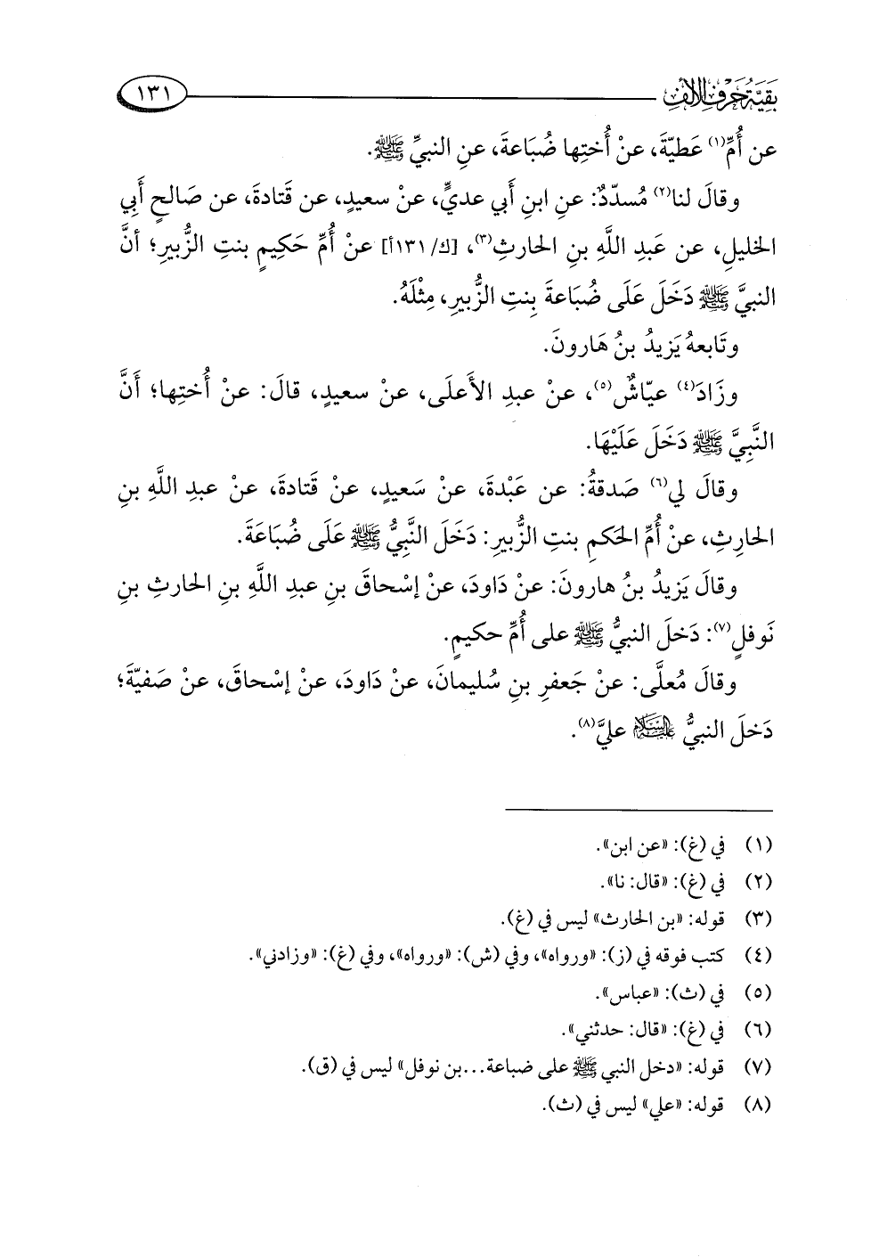 وقالَ لنا (¬٢) مُسدّدٌ: عنِ ابنِ أَبي عديٍّ، عنْ سعيدٍ، عن قَتادةَ، عن صَالحٍ أَبِي الخليلِ، عن عَبدِ اللَّهِ بنِ الحارثِ (¬٣)، عنْ أُمِّ حَكِيمٍ بنتِ الزُّبيرِ، أنَّ النبيَّ -صلى اللَّه عليه وسلم- دخَلَ عَلَى ضُبَاعةَ بِنتِ الزُّبيرِ، مِثْلَهُ.