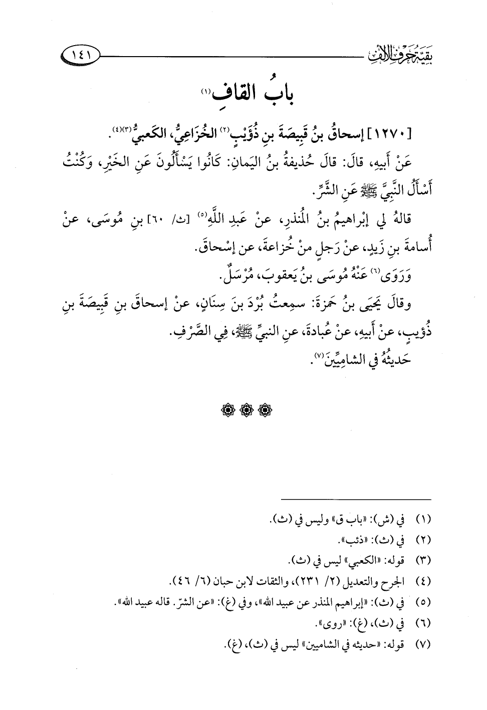 قالهُ لي إبْراهيمُ بنُ المُنذرِ، عنْ عَبدِ اللَّهِ (¬٥) بنِ مُوسَى، عنْ أُسامةَ بنِ زَيدٍ، عنْ رَجلٍ منْ خُزاعةَ، عن إسْحاقَ.