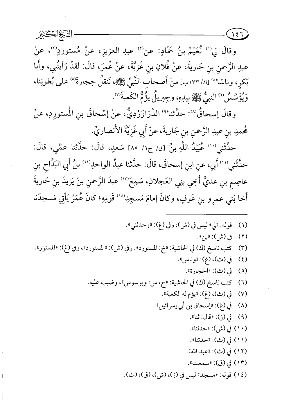 وقالَ لي (¬١) نُعَيْمُ بنُ حَمَّادٍ: عن (¬٢) عبدِ العزيزِ، عنْ مُستوردٍ (¬٣)، عنْ عبدِ الرَّحمنِ بنِ جَاريةَ، عنْ فُلانِ بنِ غَزيَّةَ، عنْ عُمرَ، قالَ: لقدْ رَأيتُنِي، وأَبا بَكرٍ، وناسًا (¬٤) منْ أَصحابِ النَّبيِّ -صلى اللَّه عليه وسلم-، نَنقلُ حِجارةً (¬٥) على بُطونِنا، وَيُؤَسِّسُ (¬٦) النبيُّ -صلى اللَّه عليه وسلم- الدَّرَوَدِيُّ، وجِبريلُ يؤُمُّ الكَعبةَ (¬٧).