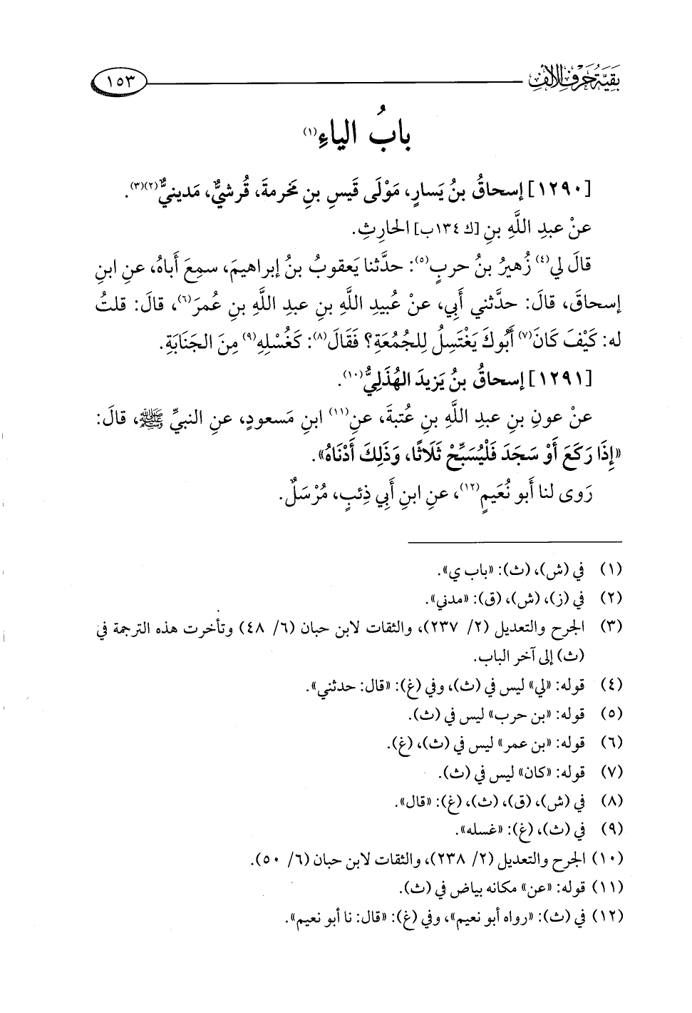 قالَ لي (¬٤) زُهيرُ بنُ حربٍ (¬٥): حدَّثنا يَعقوبُ بنُ إبراهيمَ، سمِعَ أَباهُ، عنِ ابنِ إسحاقَ، قالَ: حدَّثني أَبِي، عنْ عُبيدِ اللَّهِ بنِ عبدِ اللَّهِ بنِ عُمرَ (¬٦)، قالَ: قلتُ له: كَيْفَ كَانَ (¬٧) أَبُوكَ يَغْتَسِلُ لِلجُمُعَةِ؟ فَقَالَ (¬٨): كَغُسْلِهِ (¬٩) مِنَ الجَنَابَةِ.