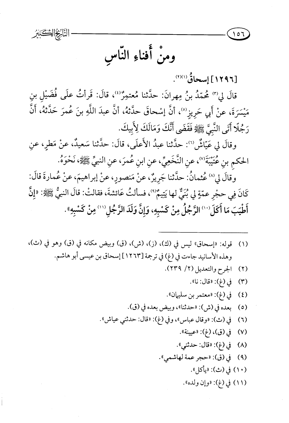 وقالَ لي (¬٨) عُثمانُ: حدَّثنا جَرِير، عنْ مَنصورٍ، عنْ إبراهيمَ، عنْ عُمارةَ قالَ: كَانَ فِي حجْرِ عمّةٍ لي بُنَيٌّ لها يَتيمٌ (¬٩)، فسألتُ عَائشةَ، فقالتْ: قالَ النبيُّ -صلى اللَّه عليه وسلم-: "إِنَّ أَطْيَبَ مَا أَكَلَ (¬١٠) الرَّجُلُ مِنْ كسْبِهِ، وَإِنَّ وَلَدَ الرَّجُلِ (¬١١) مِنْ كَسْبِهِ".