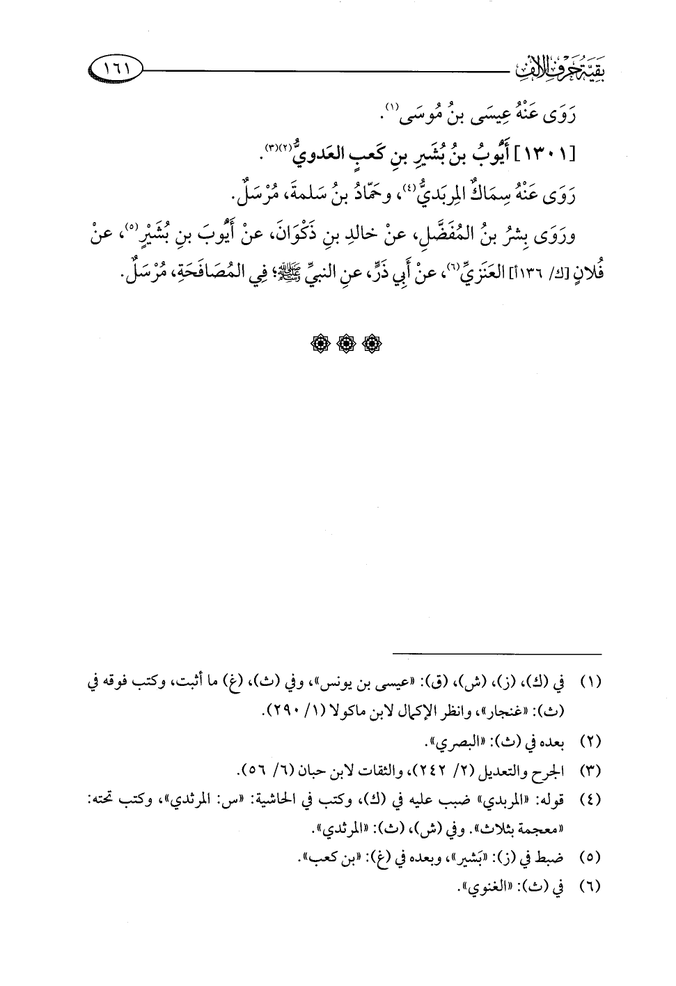 (¬١) في (ك)، (ز)، (ش)، (ق): "عيسى بن يونس"، وفي (ث)، (غ) ما أثبت، وكتب فوقه في (ث): "غنجار"، وانظر الإكمال لابن ماكولا (١/ ٢٩٠).