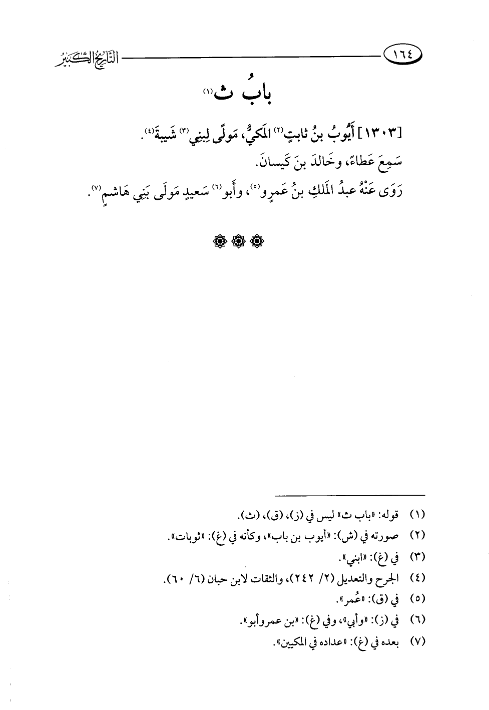 [١٣٠٣] أَيُّوبُ بنُ ثابتٍ (¬٢) المَكيُّ، مَولًى لِبني (¬٣) شَيبةَ (¬٤).