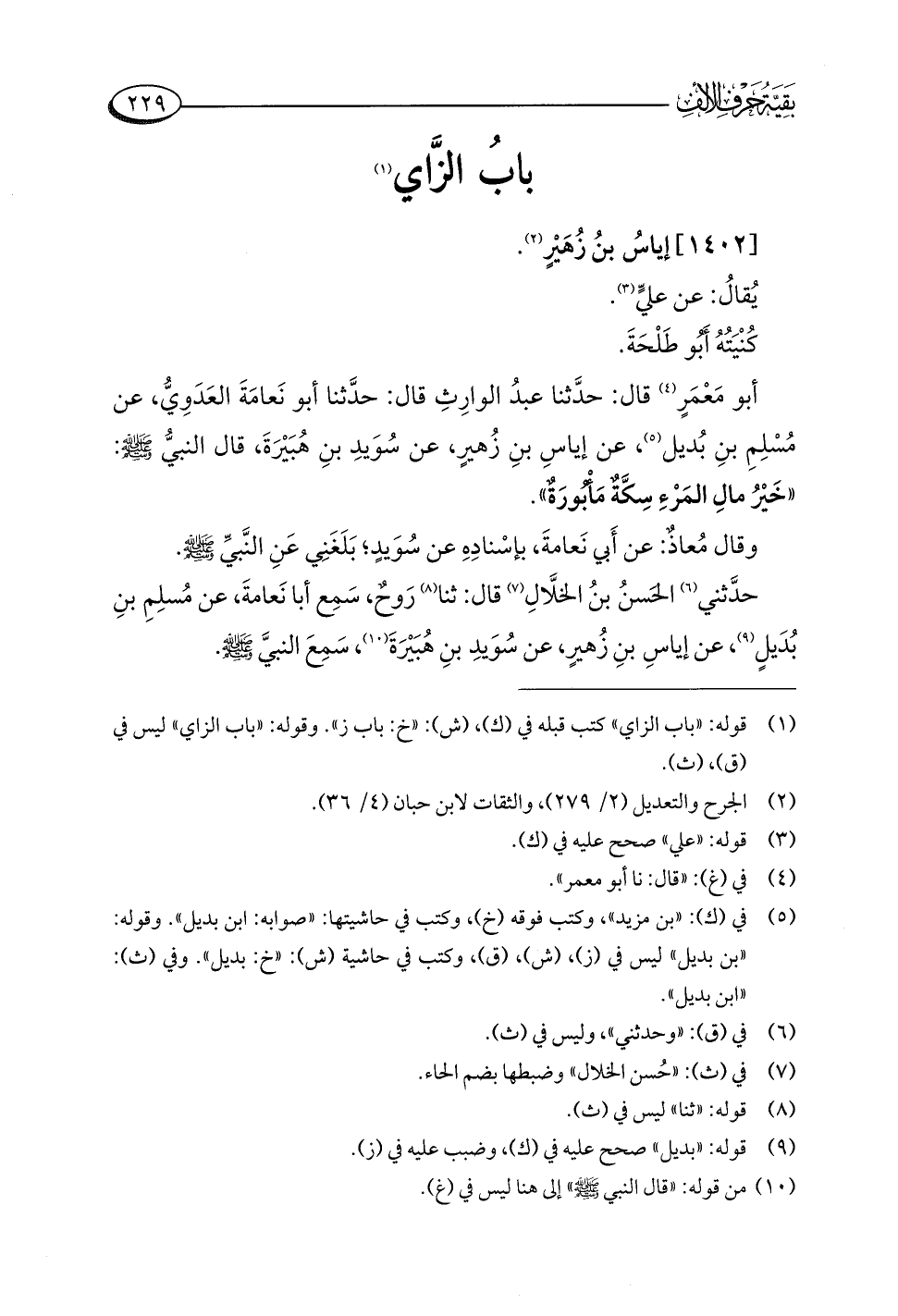 أبو مَعْمَرٍ (¬٤) قال: حدَّثنا عبدُ الوارِثِ قال: حدَّثنا أبو نَعامَةَ العَدَوِيُّ، عن مُسْلِمِ بنِ بُديل (¬٥)، عن إياسِ بنِ زُهيرٍ، عن سُوَيدِ بنِ هُبَيْرَةَ، قال النبيُّ -صلى اللَّه عليه وسلم-: "خَيْرُ مالِ المَرْءِ سِكَّة مَأْبُورَةٌ".
