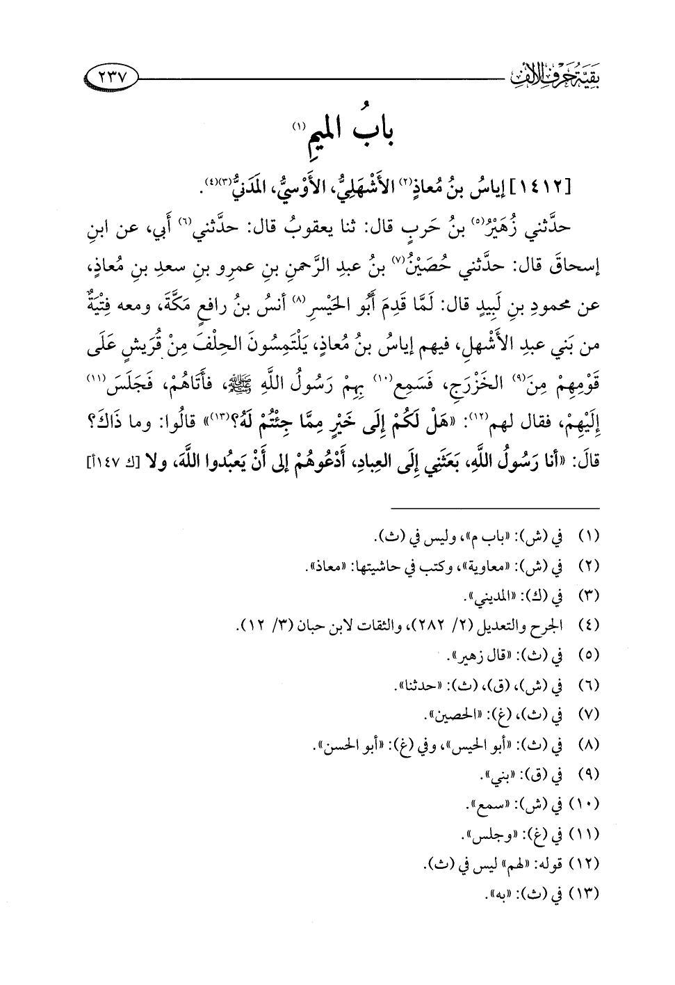 حدَّثني زُهَيْرُ (¬٥) بنُ حَربٍ قَالَ: ثنا يعقوبُ قَالَ: حدَّثني (¬٦) أَبي، عن ابنِ إسحاقَ قَالَ: حدَّثني حُصَيْنُ (¬٧) بنُ عبدِ الرَّحمنِ بنِ عمرِو بنِ سعدِ بنِ مُعاذٍ، عن محمودِ بنِ لَبِيدٍ قَالَ: لَمَّا قَدِمَ أَبُو الحَيْسرِ (¬٨) أنسُ بنُ رافعٍ مَكَّةَ، ومعه فِتْيَةٌ من بَني عبدِ الأَشْهلِ، فيهم إياسُ بنُ مُعاذٍ، يَلْتَمِسُونَ الحِلْفَ مِنْ قُرَيشٍ عَلَى قَوْمِهِمْ مِنَ (¬٩) الخَزْرَجِ، فَسَمِع (¬١٠) بِهِمْ رَسُولُ اللَّهِ -صلى اللَّه عليه وسلم-، فأَتَاهُمْ، فَجَلَسَ (¬١١) إِلَيْهِمْ، فقال لهم (¬١٢): "هَلْ كُمْ إِلَى خَيْرٍ مِمَّا جِئْتُمْ لَهُ؟ (¬١٣) " قالُوا: وما ذَاكَ؟ قالَ: "أنا رَسُوُل اللَّهِ، بَعَثَنِي إِلَى العِبادِ، أَدْعُوهُمْ إِلَى أَنْ يَعبُدوا اللَّهَ، وَلَا