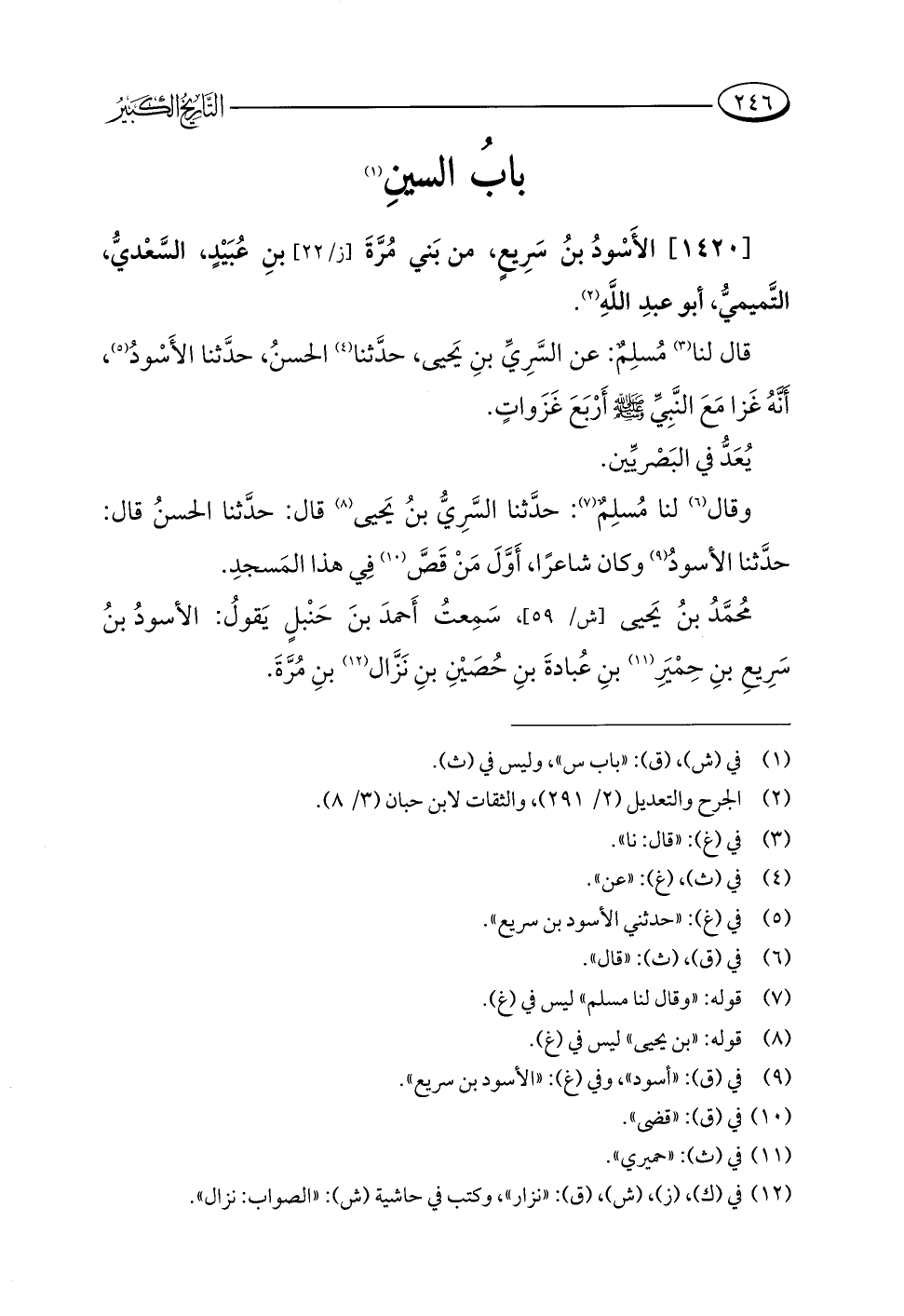 مُحمَّدُ بنُ يَحيى، سَمِعتُ أَحمدَبنَ حَنْبلٍ يَقولُ: الأسودُ بنُ سَرِيعِ بنِ حِمْيَرِ (¬١١) بنِ عُبادةَ بنِ حُصَيْنِ بنِ نَزَّال (¬١٢) بنِ مُرَّةَ.