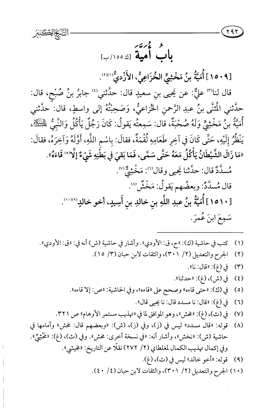 (¬٨) قوله: "قال مسدد" ليس في (ز)، وفي (ز)، (ش): "وبعضهم قال: مخش" وأمامها في حاشية (ش): "نخش"، وأشار أنه: "في نسخة أخرى: مخش". وفي (ث)، (غ): "مَخْشِيٌ". وفي إكمال تهذيب الكمال لمغلطاي (٢/ ٢٧٢) نقلًا عن التاريخ: "مخيشي".