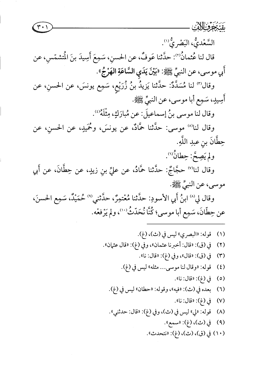 وقال لي (¬٨) ابنُ أَبي الأسودِ: حدَّثنا مُعْتمِرٌ، حدَّثني (¬٩) حُمَيْدٌ، سَمِع الحسنَ، عن حِطّانَ، سَمِع أبا موسى؛ كُنَّا نُحَدّثُ (¬١٠)، ولم يَرْفعْه.