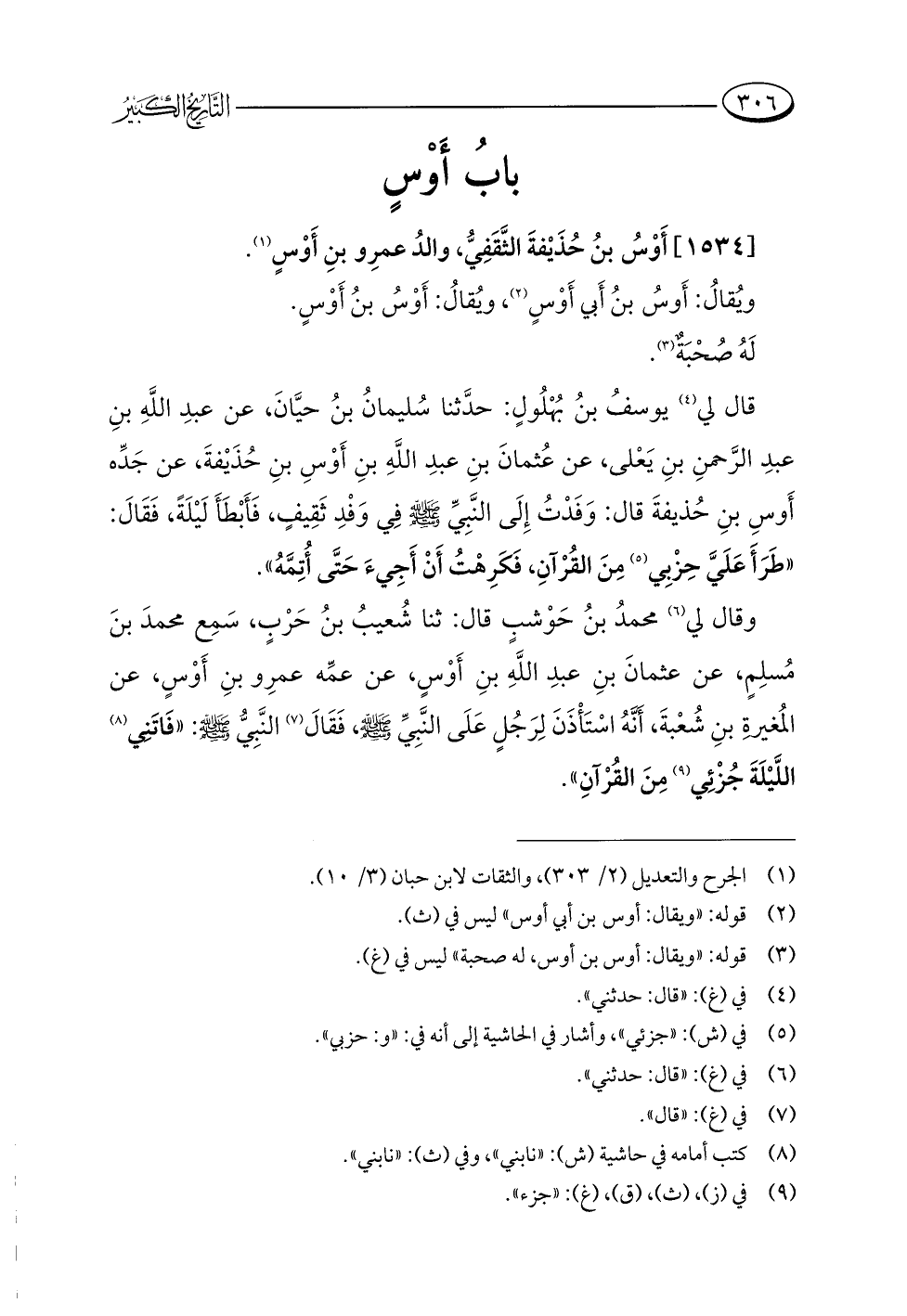 وقال لي (¬٦) محمدُ بنُ حَوْشبٍ قال: ثنا شُعيبُ بنُ حَرْبٍ، سَمِع محمدَ بنَ مُسلِمٍ، عن عثمانَ بنِ عبدِ اللَّهِ بنِ أَوْسٍ، عن عمِّه عمرِو بنِ أَوْسٍ، عن المُغيرةِ بنِ شُعْبةَ، أَنَّهُ اسْتَأْذَنَ لِرَجُلٍ عَلَى النَّبِيِّ -صلى اللَّه عليه وسلم-، فَقَالَ (¬٧) النَّبِيُّ -صلى اللَّه عليه وسلم-: "فَاتَنِي (¬٨) اللَّيْلَةَ جُزْئِي (¬٩) مِنَ القُرْآنِ".