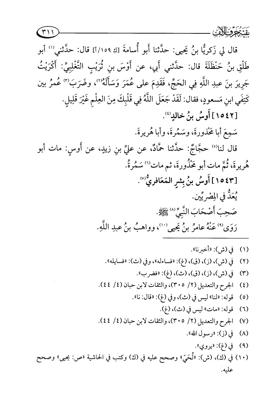 قال لي زَكريّا بنُ يَحيى: حدَّثنا أَبو أُسامةَ قال: حدَّثني (¬١) أبو طَلْقِ بنُ حَنْظَلَةَ قال: حدَّثني أَبي، عن أَوْسَ بنِ ثُرَيْبٍ التَّغْلِبِيِّ: أَكْرَيْتُ جَرِيرَ بنَ عبدِ اللَّهِ فِي الحَجِّ، فَقَدِمَ على عُمَرَ وَسَأَلَهُ (¬٢)، وضَرَبَ (¬٣) عُمرُ بين كَتِفَي ابنِ مَسعودٍ، فقال: لَقَدْ جَعَلَ اللَّهُ فِي قَلْبِكَ مِنَ العِلْمِ غَيْرَ قَلِيلٍ.