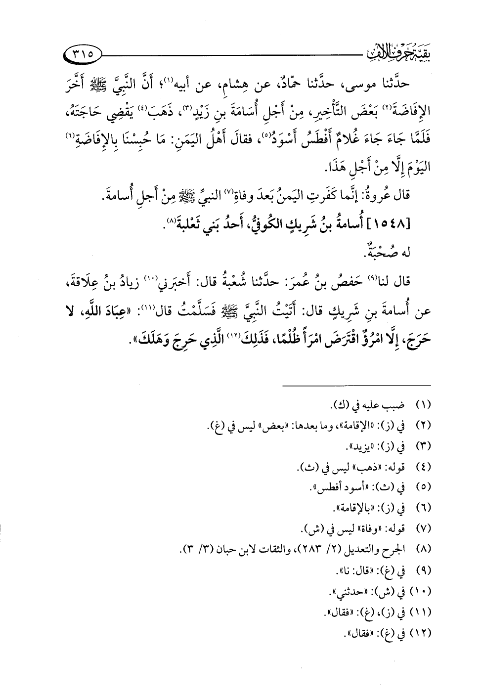 قال لنا (¬٩) حَفصُ بنُ عُمرَ: حدَّثنا شُعْبةُ قال: أَخبَرني (¬١٠) زيادُ بنُ عِلَاقةَ، عن أُسامةَ بنِ شَرِيكٍ قال: أَتَيْتُ النَّبِيَّ -صلى اللَّه عليه وسلم- فَسَلَّمْتُ قال (¬١١): "عِبَادَ اللَّهِ، لا حَرَجَ، إِلَّا امْرُؤٌ اقْتَرَضَ امْرَأً ظُلْمًا، فَذَلِكَ (¬١٢) الَّذِي حَرِجَ وَهَلَكَ".
