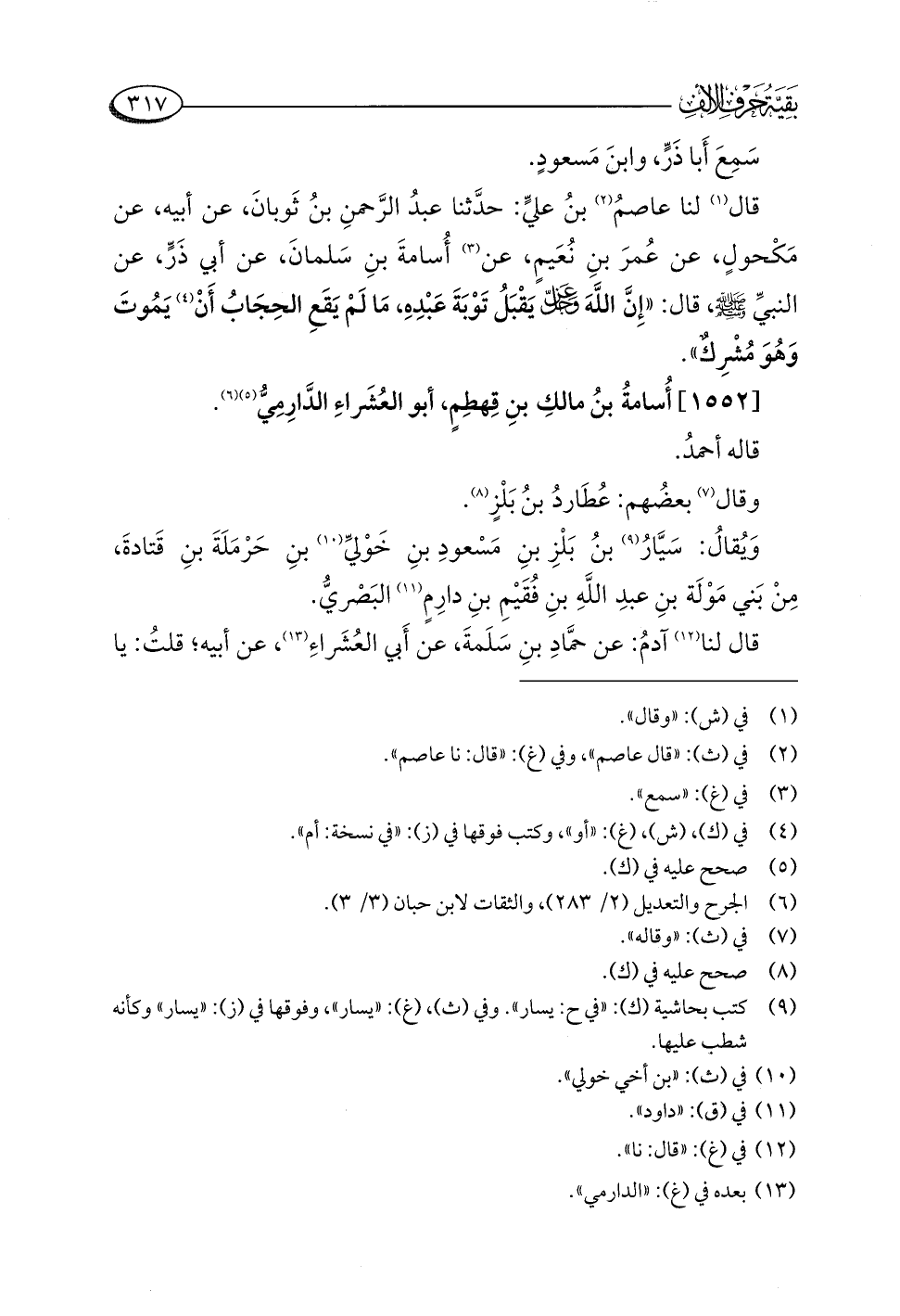 [١٥٥٢] أُسامةُ بنُ مالكِ بنِ قِهطِمٍ، أبو العُشَراءِ الدَّارِمِيُّ (¬٥) (¬٦).
