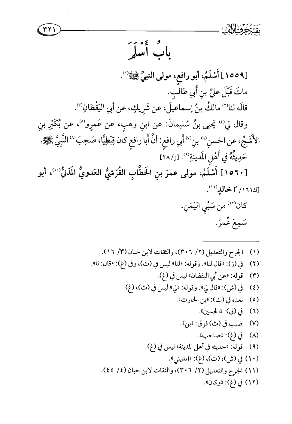 [١٥٦٠] أَسْلَمُ، مولى عمرَ بنِ الخَطَّابِ القُرَشيُّ العَدويُّ المَدَنيُّ (¬١٠)، أبو خالدٍ (¬١١).