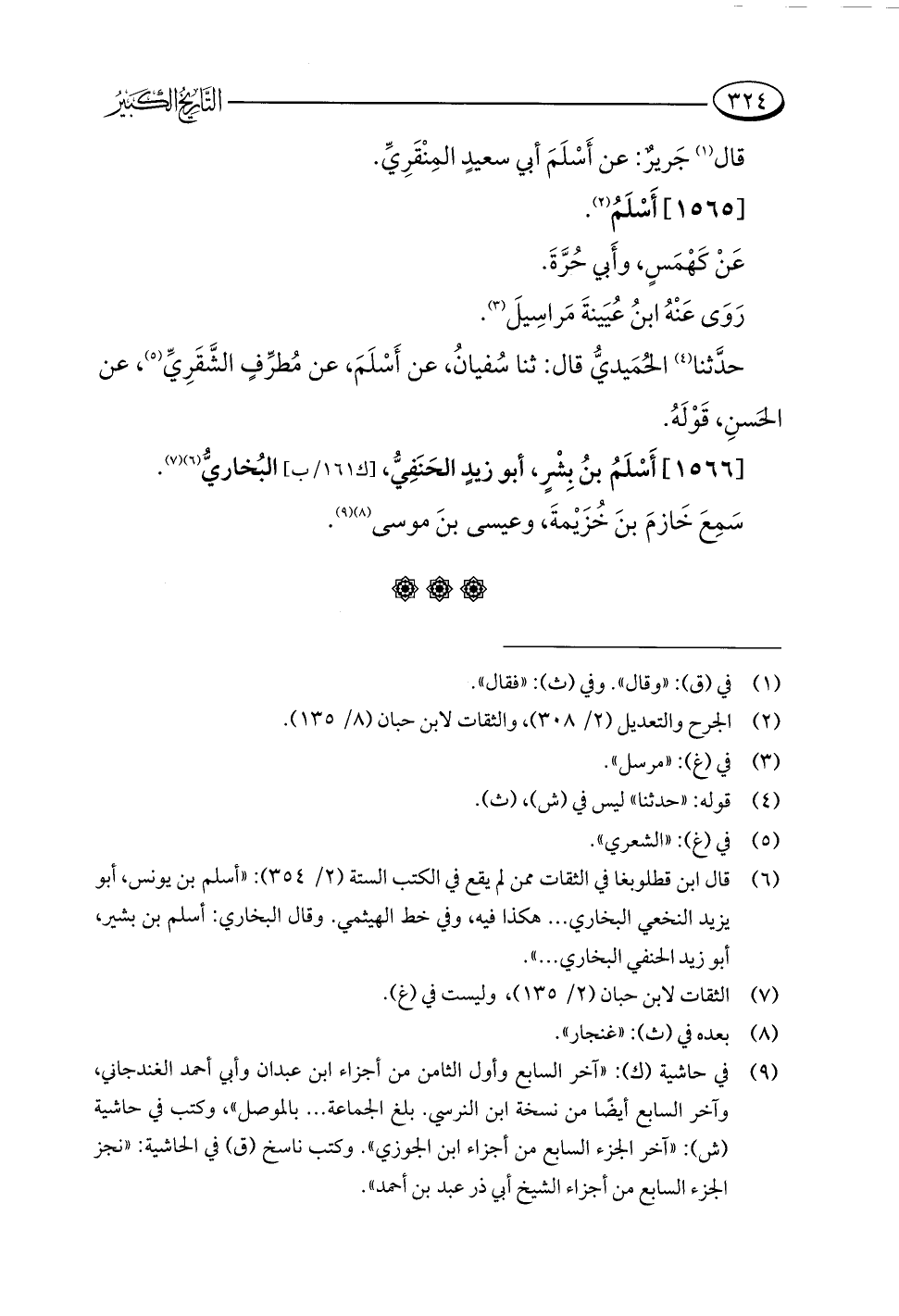(¬٦) قال ابن قطلوبغا في الثقات ممن لم يقع في الكتب الستة (٢/ ٣٥٤): "أسلم بن يونس، أبو يزيد النخعي البخاري. . . هكذا فيه، وفي خط الهيثمي. وقال البخاري: أسلم بن بشير، أبو زيد الحنفي البخاري. . . ".