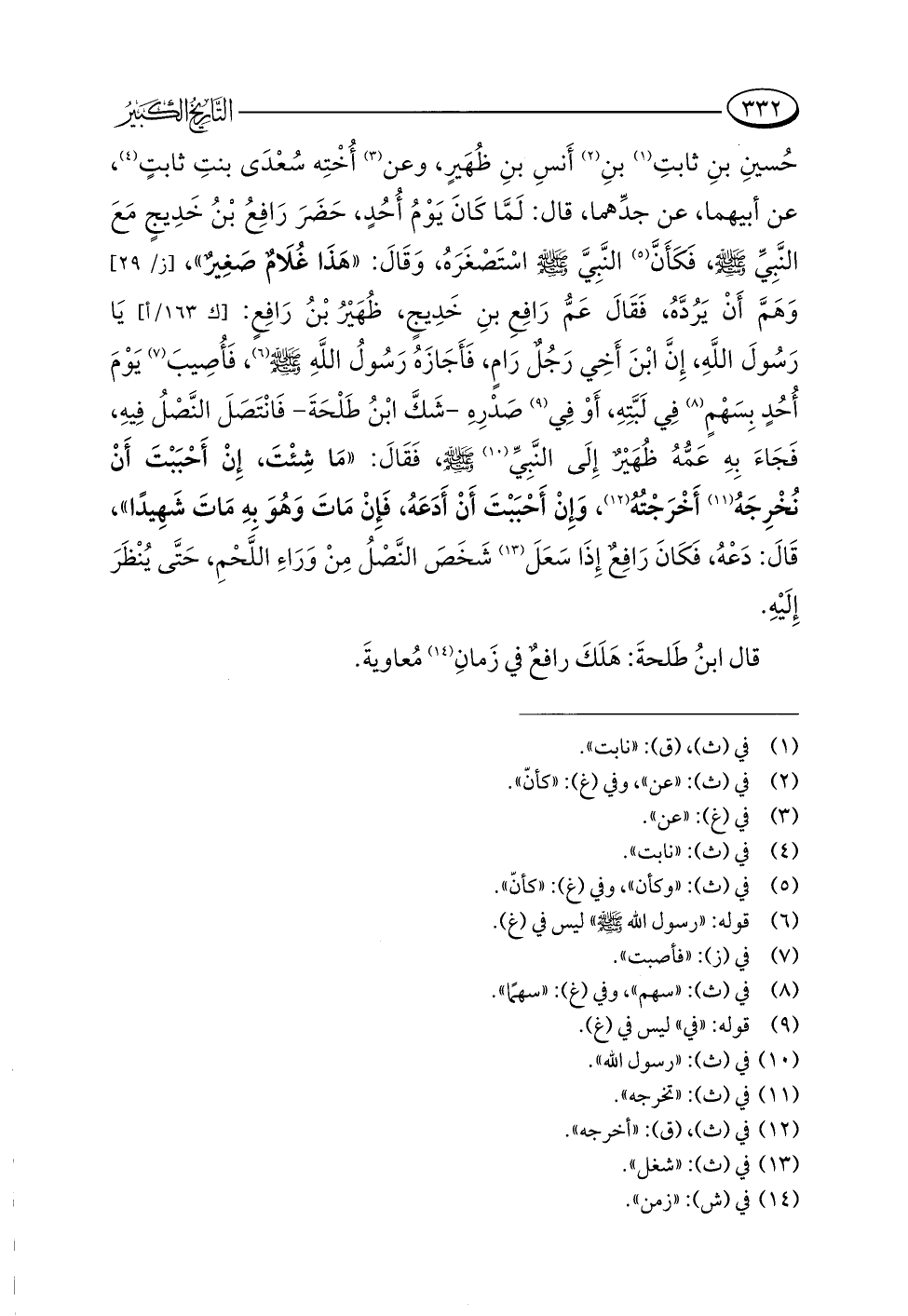 حُسينِ بنِ ثابتِ (¬١) بنِ (¬٢) أَنسِ بنِ ظُهَيرٍ، وعن (¬٣) أُخْتِه سُعْدَى بنتِ ثابتٍ (¬٤)، عن أبيهما، عن جدِّهما، قال: لَمَّا كَانَ يَوْمُ أُحُدٍ، حَضَرَ رَافِعُ بْنُ خَدِيجٍ مَعَ النَّبِيِّ -صلى اللَّه عليه وسلم-، فكَأَنَّ (¬٥) النَّبِيَّ -صلى اللَّه عليه وسلم- استَصغَرَهُ، وَقَالَ: "هَذَا غلَامٌ صغيرٌ"، وَهَمَّ أَنْ يَرُدَّهُ، فَقَالَ عَمُّ رَافِعِ بنِ خَدِيجٍ، ظُهَيْرُ بْنُ رَافِعٍ: يَا رَسُولَ اللَّهِ، إِنَّ ابْنَ أَخِي رَجُلٌ رَامٍ، فَأَجَازَهُ رَسُولُ اللَّهِ -صلى اللَّه عليه وسلم- (¬٦)، فَأُصِيبَ (¬٧) يَوْمَ أُحُدٍ بِسَهْمٍ (¬٨) فِي لَبَّتِهِ، أَوْ فِي (¬٩) صَدْرِهِ -شَكَّ ابْنُ طَلْحَةَ- فَانْتَصَلَ النَّصْلُ فِيهِ، فَجَاءَ بِهِ عَمُّهُ ظُهَيْر إِلَى النَّبِيِّ (¬١٠) -صلى اللَّه عليه وسلم-، فَقَالَ: "مَا شِئْتَ، إِنْ أَحْبَبْتَ أَنْ نُخْرِجَهُ (¬١١) أَخْرَجْتهُ (¬١٢)، وَإِنْ أَحْبَبْتَ أَنْ أَدَعَهُ، فَإِنْ مَاتَ وَهُوَ بهِ مَاتَ شَهِيدًا"، قَالَ: دَعْهُ، فكَانَ رَافِعٌ إِذَا سَعَلَ (¬١٣) شَخَصَ النَّصْلُ مِنْ وَرَاءِ اللَّحْمِ، حَتَّى يُنْظَرَ إِلَيهِ.