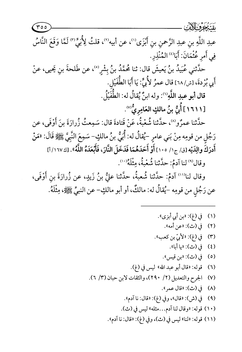 حدَّثنا عمرٌو (¬٨)، حدَّثنا شُعْبةُ، عَنْ قَتادةَ قال: سَمِعتُ زُرارَةَ بنَ أَوْفَى، عن رَجُلٍ من قومِه مِنْ بَني عامرٍ -يُقالُ له: أُبَيُّ بنُ مالكٍ- سَمِعَ النَّبِيَّ -صلى اللَّه عليه وسلم- قَالَ: "مَنْ أَدرَكَ والِدَيْه أَوْ أَحَدَهُمَا فَدَخَلَ النَّارَ، فَأَبْعَدَهُ اللَّهُ".