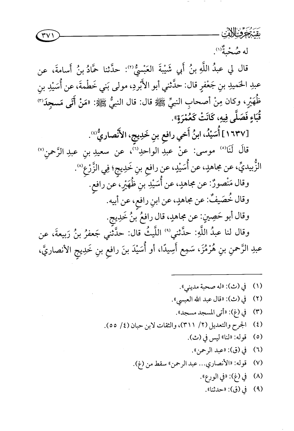 قال لي عبدُ اللَّهِ بنُ أَبي شَيْبةَ العَبْسيُّ (¬٢): حدَّثنا حمَّادُ بنُ أَسامةَ، عن عبدِ الحَميدِ بنِ جَعْفرٍ قال: حدَّثني أبو الأَبْردِ، مولى بَني خَطْمةَ، عن أُسَيْدِ بنِ ظُهَيْرٍ، وكان مِنْ أصحابِ النبيِّ -صلى اللَّه عليه وسلم- قال: قال النبيُّ -صلى اللَّه عليه وسلم-: "مَنْ أَتَى مَسجِدَ (¬٣) قُبَاءٍ فَصَلَّى فِيهِ، كَانَتْ كَعُمْرَةٍ".