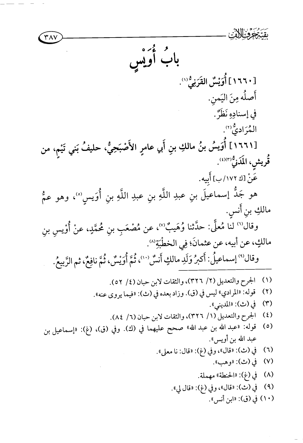 [١٦٦١] أُوَيسُ بنُ مالكِ بنِ أَبي عامرٍ الأَصْبَحِيُّ، حليفُ بَني تَيْمٍ، من قُريشٍ، المَدَنيُّ (¬٣) (¬٤).