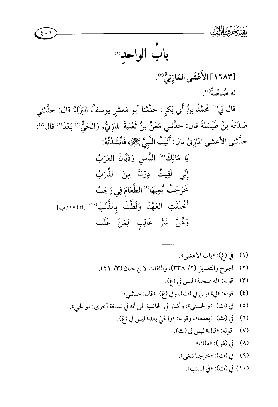 قال لي (¬٤) مُحمَّدُ بنُ أَبي بَكرٍ: حدَّثنا أبو مَعشَرٍ يوسفُ البَرَّاءُ قال: حدَّثني صَدَقةُ بنُ طَيْسَلةَ قال: حدَّثني مَعْنُ بنُ ثَعْلبةَ المازِنيُّ، وَالحَيُّ (¬٥) بَعْدُ (¬٦) قال (¬٧): حدَّثني الأعشى المازِنيُّ قال: أَتَيْتُ النَّبِيَّ -صلى اللَّه عليه وسلم-، فَأَنْشَدْتُهُ: