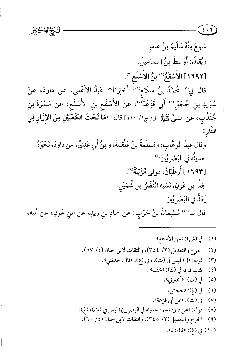 قال لي (¬٣) مُحمَّدُ بنُ سلَامٍ (¬٤): أَخبَرنا (¬٥) عَبدُ الأَعْلى، عن داودَ، عنْ سُوَيدِ بنِ حُجَيْرٍ (¬٦) أَبي قَزَعَةَ (¬٧)، عن الأَسْقَعِ بنِ الأَسْلَعِ، عن سَمُرَةَ بنِ جُنْدُبٍ، عن النبيِّ -صلى اللَّه عليه وسلم- قال: "مَا تَحْتَ الكَعْبَيْنِ مِنَ الإِزَارِ فِي النَّارِ".