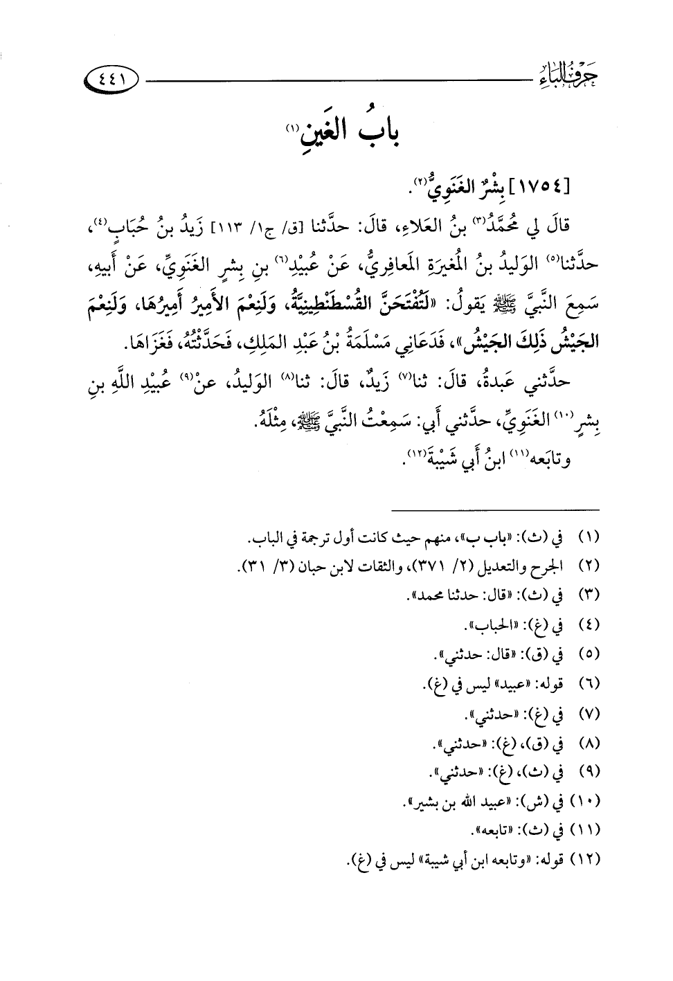 قالَ لي مُحمَّدُ (¬٣) بنُ العَلاءِ، قالَ: حدَّثنا زَيدُ بنُ حُبَابٍ (¬٤)، حدَّثنا (¬٥) الوَليدُ بنُ المُغيرَةِ المَعافِريُّ، عَنْ عُبيْدِ (¬٦) بنِ بِشرٍ الغَنَوِيِّ، عَنْ أَبيهِ، سَمِعَ النَّبيَّ -صلى اللَّه عليه وسلم- يَقولُ: "لَتُفْتَحَنَّ القُسْطَنْطِينِيَّةُ، وَلَنِعْمَ الأَمِيرُ أَمِيرُهَا، وَلَنِعْمَ الجَيْشُ ذَلِكَ الجَيْشُ"، فَدَعَانِي مَسْلَمَةُ بْنُ عَبْدِ المَلِكِ، فَحَدَّثْتُهُ، فَغَزَاهَا.