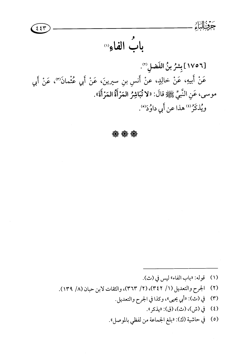 عَنْ أَبيهِ، عَنْ خالِدٍ، عنْ أَنسِ بنِ سيرينَ، عَنْ أَبي عُثْمانَ (¬٣)، عَنْ أَبي موسى، عَنِ النَّبيِّ -صلى اللَّه عليه وسلم- قالَ: "لا تُبَاشِرُ المَرْأَةُ المَرْأَةَ".