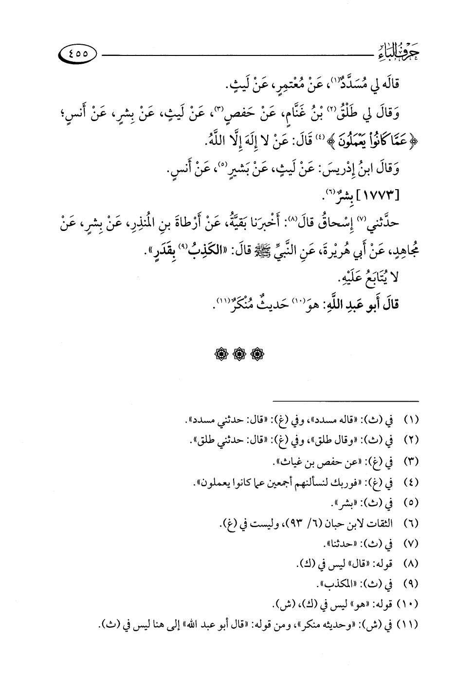 حدَّثني (¬٧) إِسْحاقُ قالَ (¬٨): أَخْبرَنا بَقيَّةُ، عَنْ أَرْطاةَ بنِ المُنذِرِ، عَنْ بِشرٍ، عَنْ مُجاهِدٍ، عَنْ أَبي هُريْرةَ، عَنِ النَّبيِّ -صلى اللَّه عليه وسلم- قالَ: "الكَذِبُ (¬٩) بِقَدَرٍ".