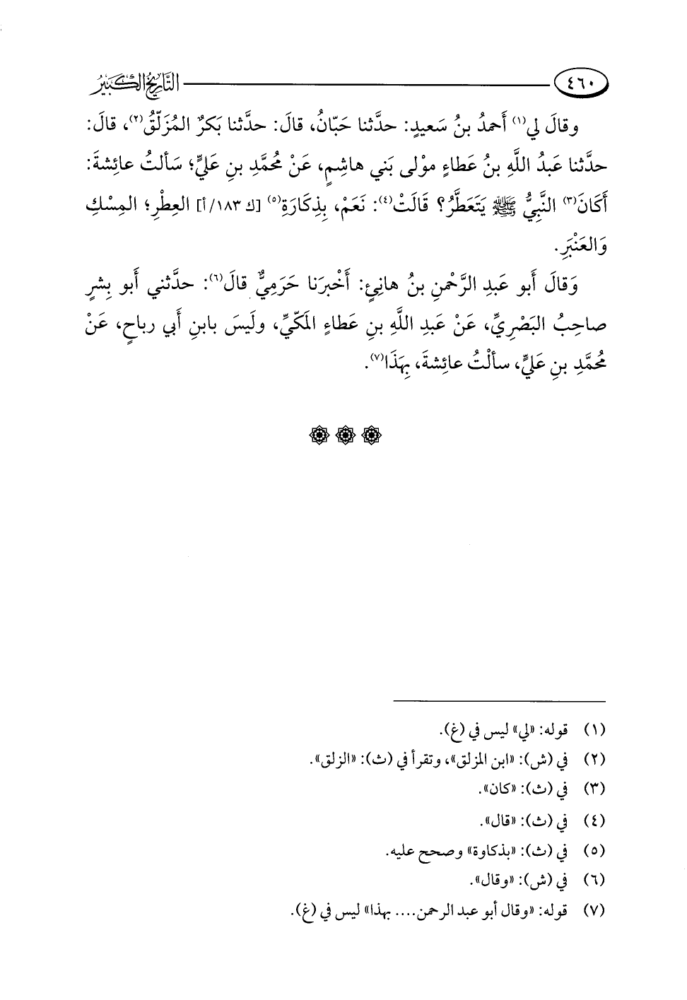 وقالَ لِي (¬١) أَحمدُ بنُ سَعيدٍ: حدَّثنا حَبّانُ، قالَ: حدَّثنا بَكر المُزَلّقُ (¬٢)، قالَ: حدَّثنا عَبدُ اللَّهِ بنُ عَطاءٍ موْلى بَني هاشِمٍ، عَنْ مُحمَّدِ بنِ عَليٍّ؛ سَألتُ عائِشةَ: أَكَانَ (¬٣) النَّبِيُّ -صلى اللَّه عليه وسلم- يَتَعَطَّرُ؟ قَالَتْ (¬٤): نَعَمْ، بِذِكَارةِ (¬٥) العِطْرِ؛ المِسْكِ وَالعَنْبَرِ.