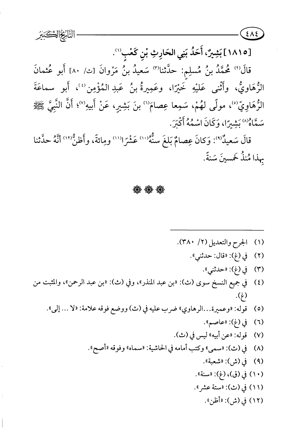قالَ (¬٢) مُحمَّدُ بنُ مُسلِمٍ: حدَّثنا (¬٣) سَعيدُ بنُ مَرْوانَ أَبو عُثمانَ الرُّهَاويُّ، وأَثْنى عَليْهِ خَيْرًا، وعَمِيرةُ بنُ عَبدِ المُؤْمِن (¬٤)، أَبو سماعَةَ الرُّهَاوِيّ (¬٥)، مولًى لهُمْ، سَمِعا عِصامَ (¬٦) بنَ بَشِيرٍ، عَنْ أَبيهِ (¬٧)؛ أَنَّ النَّبِيَّ -صلى اللَّه عليه وسلم- سَمَّاهُ (¬٨) بَشِيرًا، وَكَانَ اسْمُهُ أَكْبَرَ.