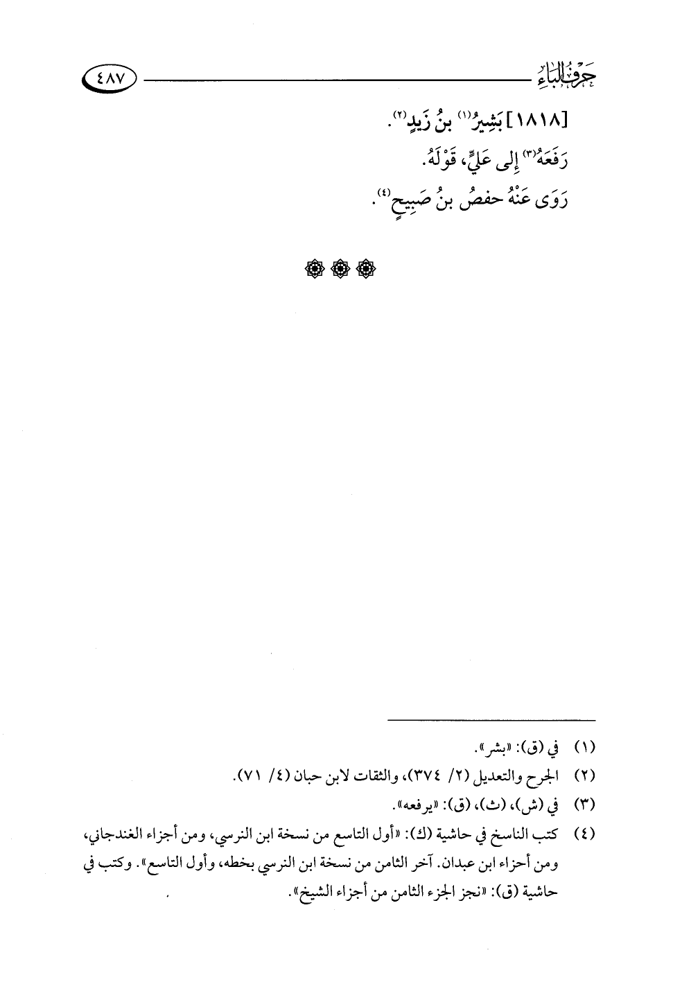 (¬٤) كتب النّاسخ في حاشية (ك): "أول التاسع من نسخة ابن النرسي، ومن أجزاء الغندجاني، ومن أحزاء ابن عبدان. آخر الثامن من نسخة ابن النرسي بخطه، وأول التاسع". وكتب في حاشية (ق): "نجز الجزء الثامن من أجزاء الشيخ".